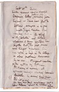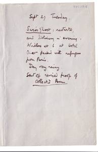 - Sept 27 Tuesday. Swiss Ghost : restarted, and dictionary in evening. Wireless at 6 at Hotel Ouest packed with refugees from Paris. Day very rainy. Sent off revised proofs of Collected Poems .