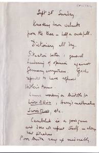 - Sept 25 Sunday. Knocking down walnuts from the tree – half a sack full. Dictionary all day. Situation better: general hardening of opinion against Germany everywhere. Czechs reported to have refused Hitler's terms. Laura working on Aristotle for Lives of Wives ,...