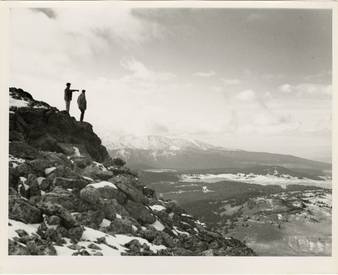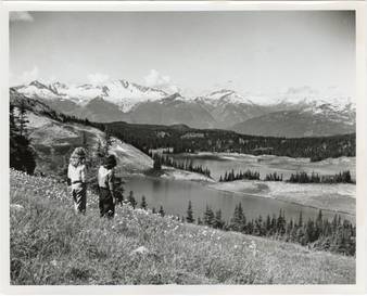 - In a folder with "Parks books [1930-ca. 1970]" and "Personal Historic" written on it. and Stamped on the verso with "Please Credit 'British Columbia Government Photograph' No. 487; Caption: Air view of Forbidden Plateau V.I. B.C. From the...