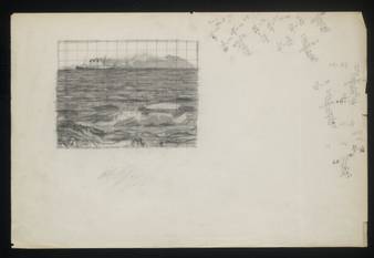 - Sketch using a grid of a steam ship in the background with waves crashing against the shore in the foreground.