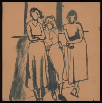 - Three women standing together and leaning on a wall with a sketch of a person's unclothed back on the verso.