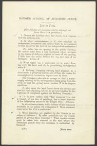 Loose item from an envelope in the Joseph B. Clearihue scrapbook (ScrpBk_2_182). A page from the "Law of Torts" section of a 1913 B.A. examination in jurisprudence, questions 1-5.