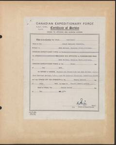 Page includes one textual record. A Certificate of Service from the Canadian Expeditionary Force, dated May 22, 1920. The certificate confirms that Joseph B. Clearihue was enlisted in the 62nd battery, Canadian Field Artillery, the 51st Howitzer Battery, C. F. A., and the 5th Canadian Divisional Ammunition Column. It also states that Joseph B. Clearihue was Struck off the Strength on July 27, 1919, due to General Demobilisation.