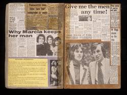 left: article with black and white illustration: “Why Marcia keeps her man” [credit: Sarah Corbett] [photo: “Marcia Newsome; with husband Eric and son Piers”]; article: “Postwomen may take ‘sex bar’ complaint to court” “Some postwomen in Birmingham; upset by what they regard as sex discrimination…”; article: “All the same I do salute a young American girl who’s fisticuffing with a New York restaurant that banned her for not wearing a bra…”; typed document: “Gay Lib Picket - End Discrimination” [statement regarding picketing at the Great Northern Hotel; possibly by Birmingham Gay Liberation Front]; untitled [black and white photograph] right: article: “Give me the men any time!” “We asked: Do you prefer to work with men or with girls?…” [readers’ letters to The Sun]; article: “Stay away if you’re not gay” “A city’s new £40;000 club has one main rule: All members must be gay…”; article: “Mr Mopp cleans up the title” “More than 1;000 Mrs Mopps got the brush-off last night when a man won a TV competition to find the South’s top char…”; illustration: black and white photo [“The man on the left is Britain’s most eligible bachelor. The man on the right won the title last year…”] [picture: Jim Hobden]
