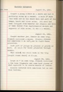 • Mustela cicognani [underlined] Alta Lake August 22, 1941. Caught a young rabbit in a snare and had it partially eaten by a weasel. A hole 1" [inch] wide had been cut in the chest wall and part of the lungs, heart and liver eaten. All meat had been stripped from humerus and scapula and bits of bone chewed from suprassopular margin and segments of ribs eaten. It was a [female symbol] weasel. August 25, 1941. Caught another juv. [juvenile] female in same trap. Stomach contained a mouse. Frontal sinuses had nematodes 4 in left, one in right - these preserved. Dark part of pelage in process of growth or molt. At least fur bases projected through dermis. This animal was still warm in the trap (caught round chest) at 8 a.m. August 30, 1941. Large ad [adult] [male symbol] in same trap. Stomach contained a few bone fragments and some hard pieces of what appeared to be coarse muscle or tendon. Sinuses infected with nematodes but no sur- face lesions.