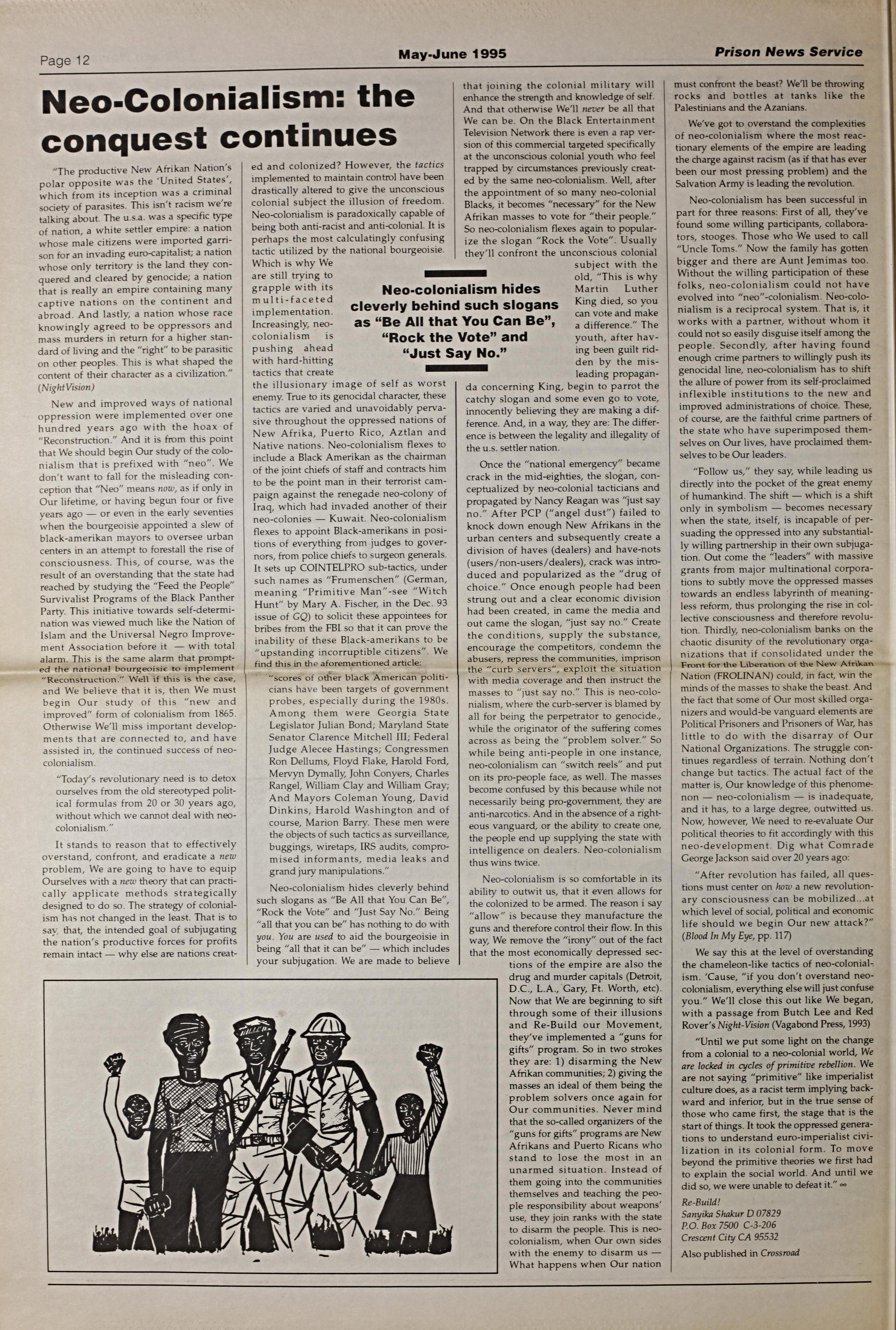 The Prison News Network (PNS) focuses on political trials, repressive abuses of imprisonment and the resistance to such oppression. It was joined with another existing prison periodical called Marionette made by prisoners for prisoners and the general public to spread awareness of the conditions prisons, Marion Penitentiary, Illinois in particular. PNS editor: Bulldozer Collective. Articles include: "Political murder"; "Support Khalfani Khaldun"; "Life-threatening medical "care" target of lawsuit: defend the lives of women in prison"; "Chowchilla retaliates against NLG jailhouse lawyer Marcia Bunney"; "Pay phone scams target prisoners' families"; "Eddie Hatcher freed after long campaign"; "CSC guard has history of brutality"; "Letter to all prisoners - let's move forward"; "New Peltier trial appeal motion filed"; "Iron House Drum : "I am not alone"; "No neutral ground" [poems] by Little Rock Reed; "Info wanted on juvenile detention"; "A statement from Little Rock Reedre: the ACA litigation project"; "Native brothers in Tennessee need help"; Bulldozer notes; "HIV/AIDS in prison systems: a comprehensive strategy"; "The National Incarcerated Muslim Network - update"; "ADX-Florence: isolation is the cornerstone"; "Torture in Conecticut's first super-max"; "Chemical warfare in Indiana control unit"; "Neo-colonialism: the conquest continues"; "Scrambling to combat genocide"; "A call for amnesty for Black political prisoners and POWs"; "Idle revolutionary"; "Nursing sister Battle Axe, or the process of monster creation in Warkworth prison"; Canadian Notes; "Murder by any other name is still murder"; "The naked emperor: human rights violations in the U.S. Book review by David Gilbert of 'A report on U.S. compliance with the International Covenant on Civil and Political Rights by Human Rights Watch and American Civil Liberties Union"; "Responses : Kommunique to our kollective; North Coast Xpress responds to Prince Imari; Re: the Prince Imari and NCX dispute"; Resources.
