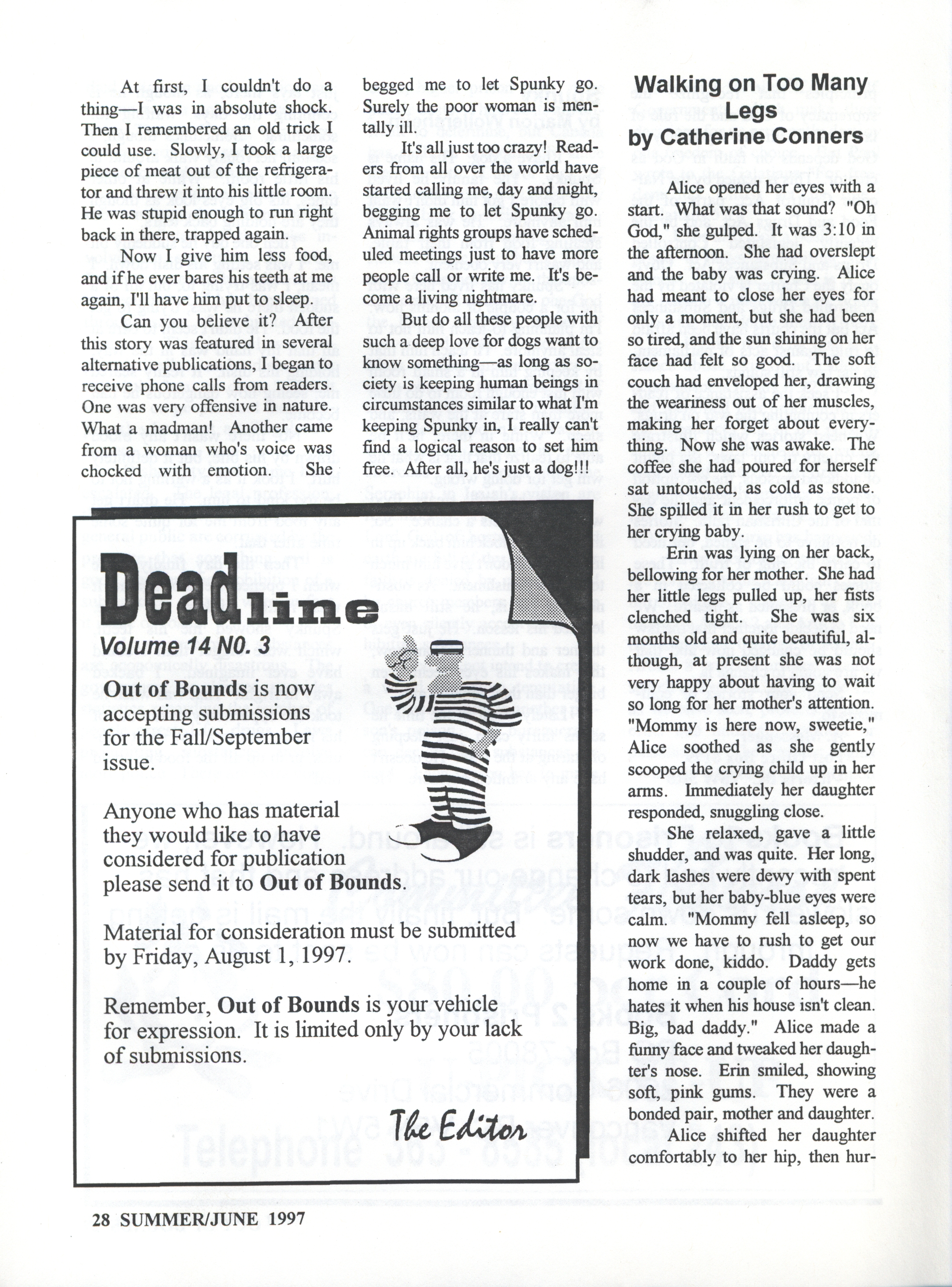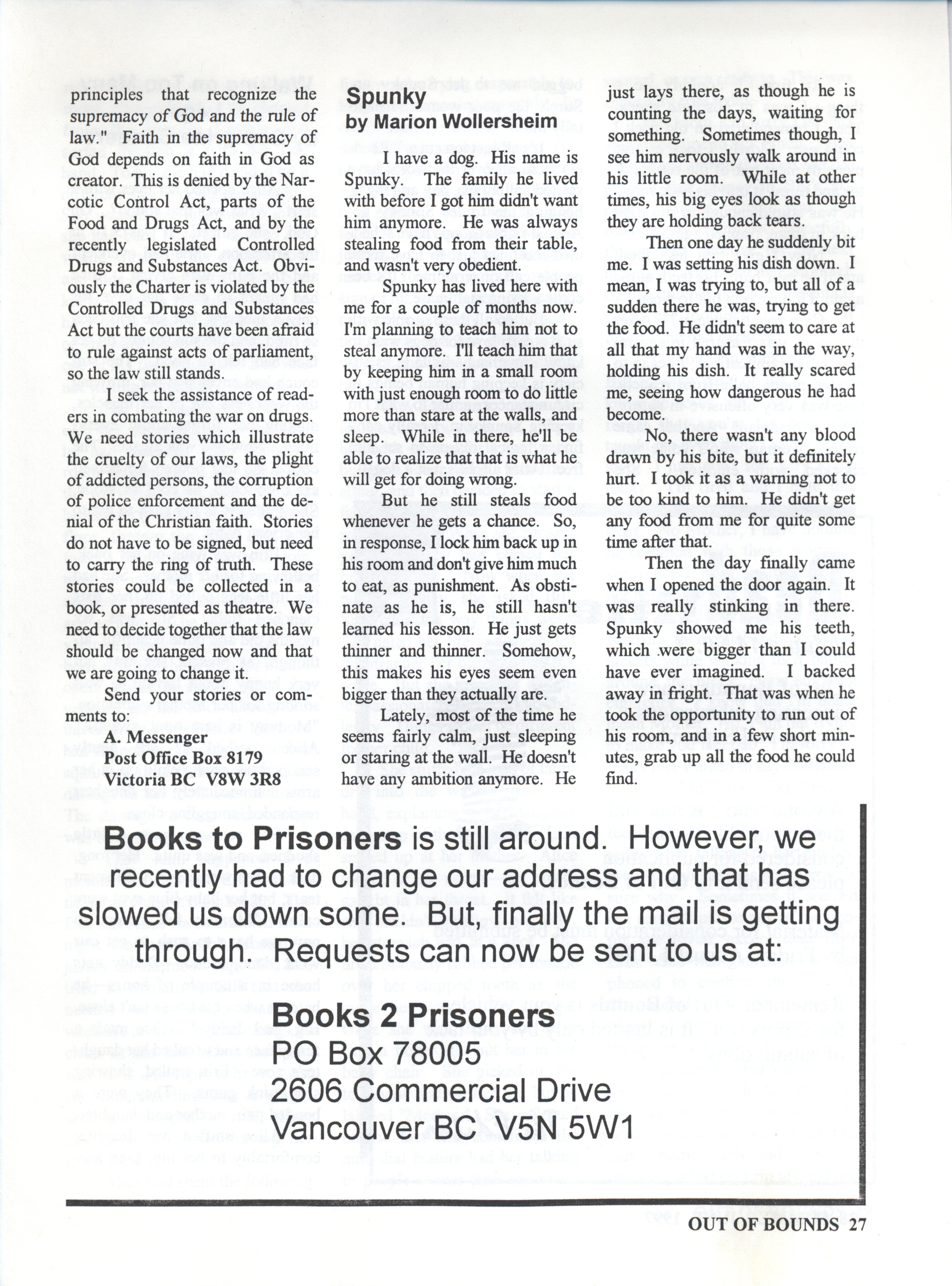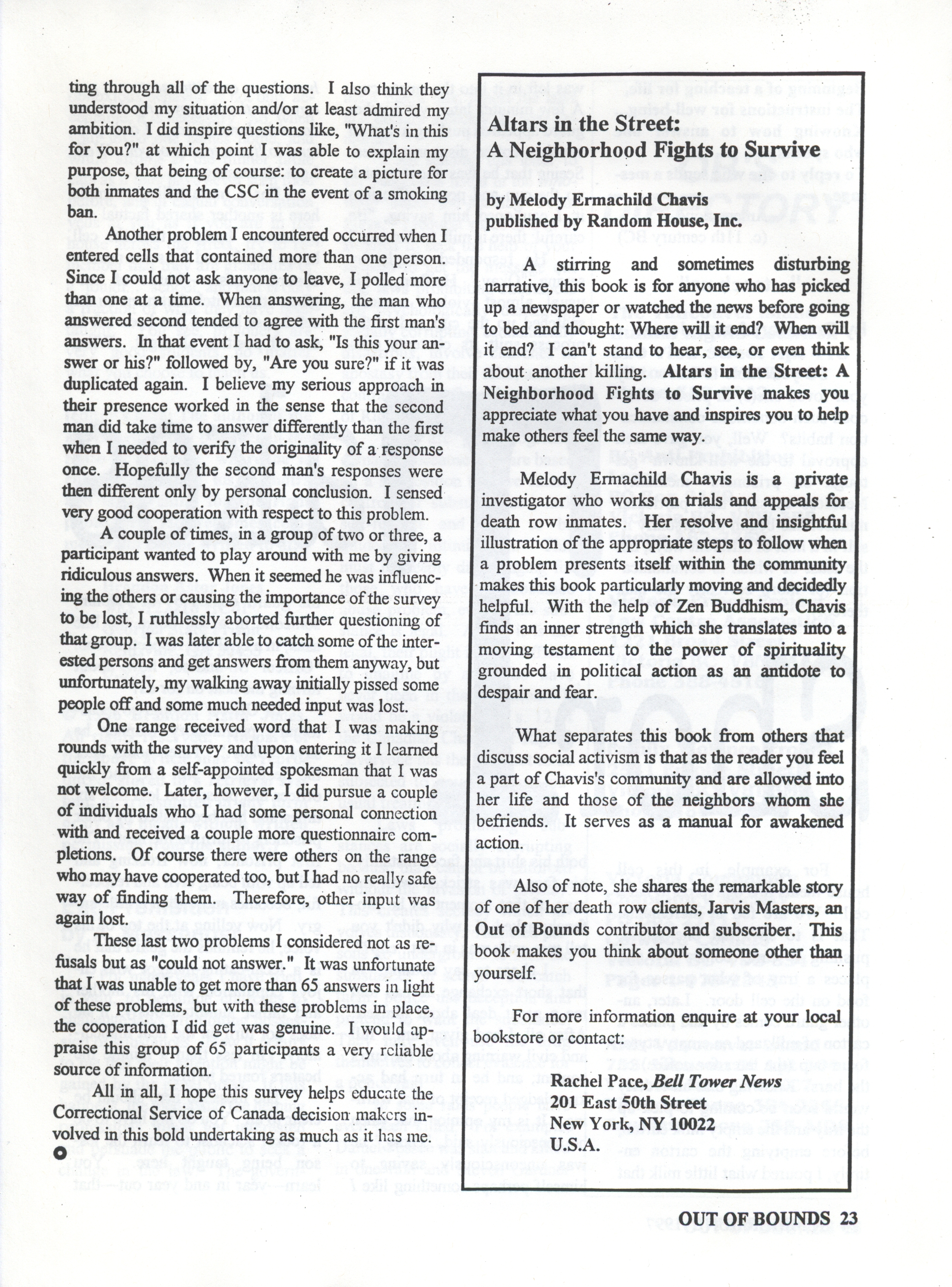 A non-profit quarterly publication of the thoughts, feelings, and distinct perspectives of prisoners and visitors by the prisoners at William Head Institution in Victoria, B.C. with the aim of providing a different view to the general public. Edited by Patrick W. Rafferty.