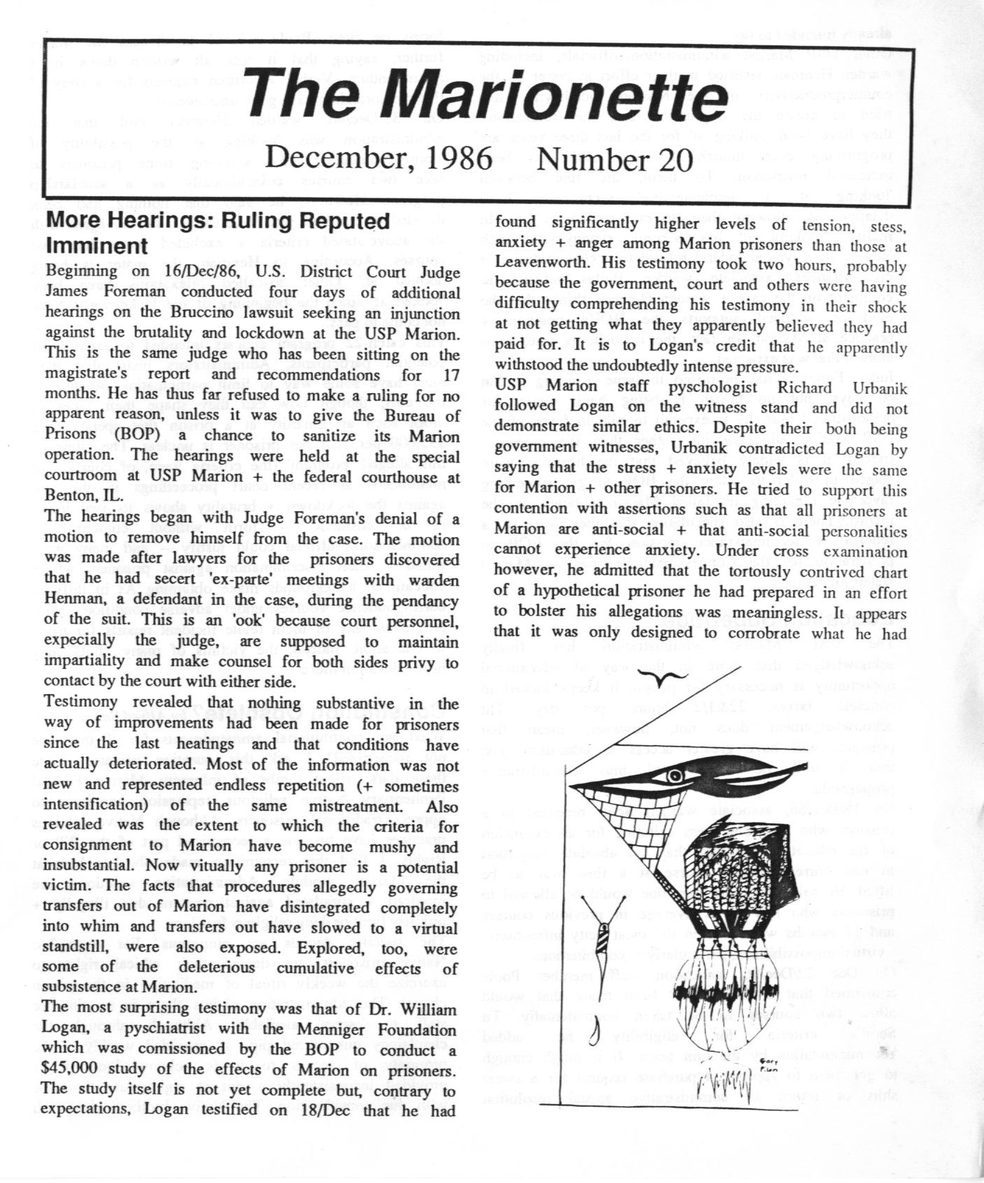 The Marionette is a prison newsletter made by prisoners for prisoners and the general public to spread awareness of the conditions prisons and in Marion Penitentiary, Illinois in particular. Later joined with Prison News Service (PNS) focused on political trials, repressive abuses of imprisonment and the resistance to such oppression.