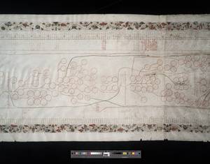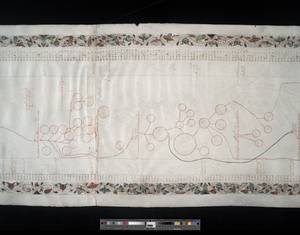 - Written on 9 skins, in red and black, marginal border of hair-line stems and heavy bell-like flowers. 2.8 mm decorative borders adorn each side in multicolor pigments (pink, blue, green, red, yellow, and grey, with gold, silver, and brown detailing), with hair-line stems and heavy bell-like flowers. Vertical columns (including borders) are ruled in ink; pricking for horizontal ruling is visible at outer edges. Genealogical lines are generally drawn in red, with plain red circles around names, but additional green lines begin on membrane 6. These seem to indicate disruptions in lineage (starting around King Stephen). Text is written in black, brown, red, and occasionally green, generally in a fifteenth-century humanistic cursive, though date columns and a few early entries are in a gothic script. Another later hand titles the roll on the dorse edge of membrane 9. It would seem that the floral border, the column of dates, and the first few records (which are in Gothic letter) belong to the year 1472 and that the remainder (which is in italic script) was done at the beginning of the 16th century. No evidence of wood or other attachments for rolling; item was originally rolled top to bottom, as evidenced by titular label on the dorse of the bottom edge and patterns of damage. Significant mold, staining, and use-related damage exists, especially at membranes 6-9. Ink fading and damage to parchment significantly affects legibility from membrane 5 on, though some faded text is recoverable under UV light. Pigments of decorative floral borders are mostly in tact until membranes 7-9, and then show significant cracking, smudging, and flaking. Wrinkling, holes, and small tears occur throughout. Evidence of repairs may be observed, especially between membranes 8-9, where parchment has been used to stabilize significant tearing and deterioration at edges.