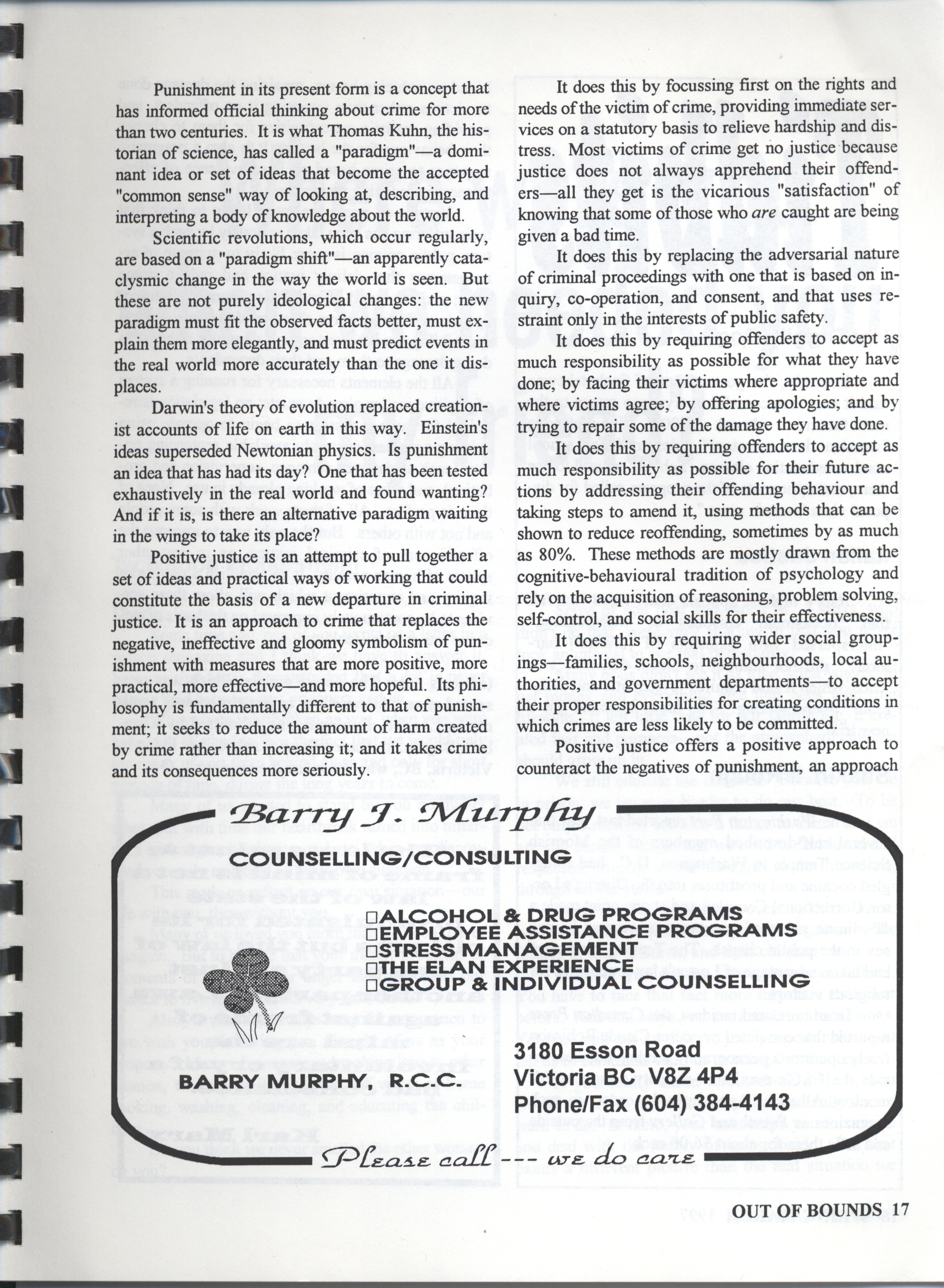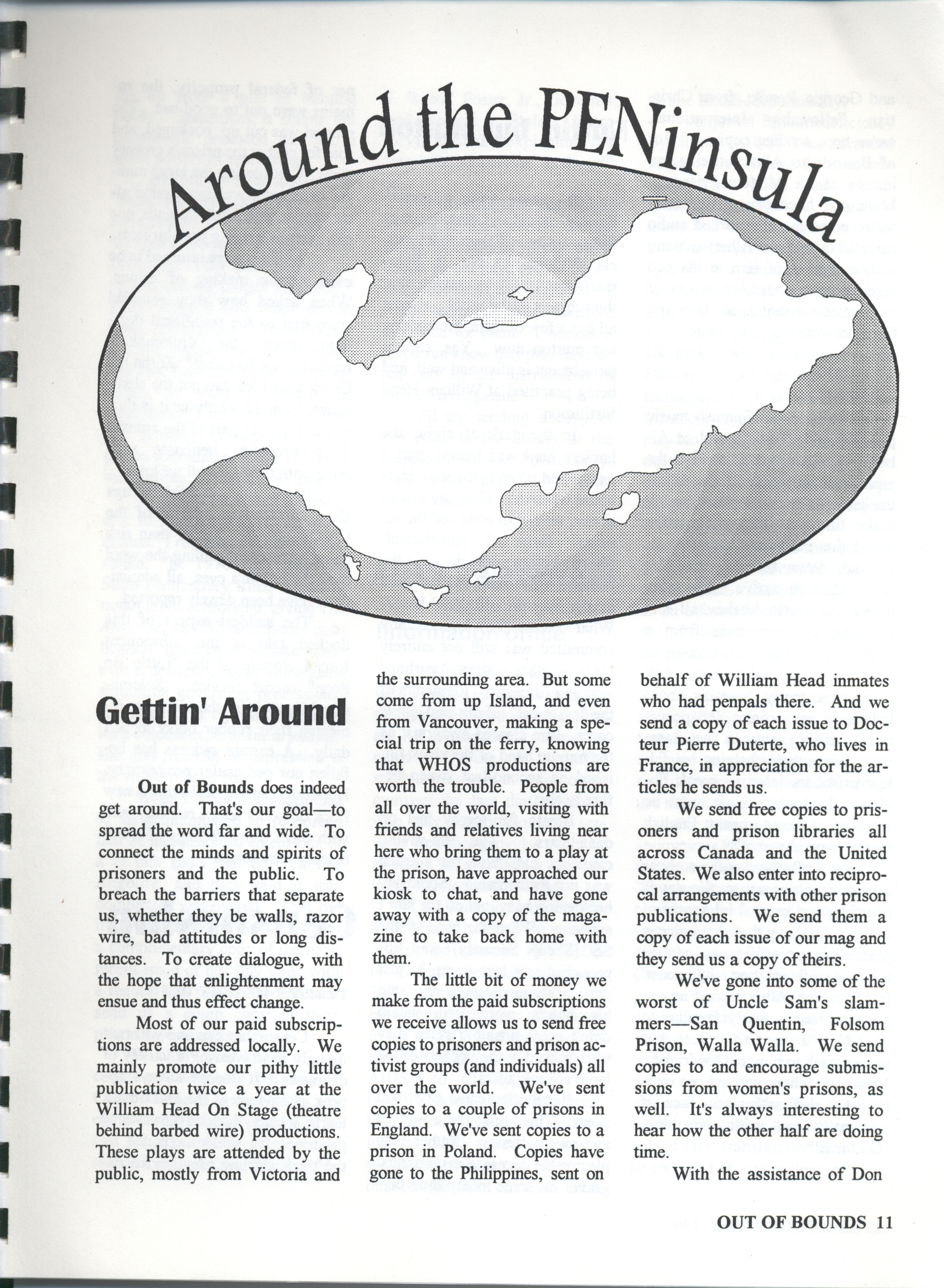 A non-profit quarterly publication of the thoughts, feelings, and distinct perspectives of prisoners and visitors by the prisoners at William Head Institution in Victoria, B.C. with the aim of providing a different view to the general public. Edited by Patrick W. Rafferty.