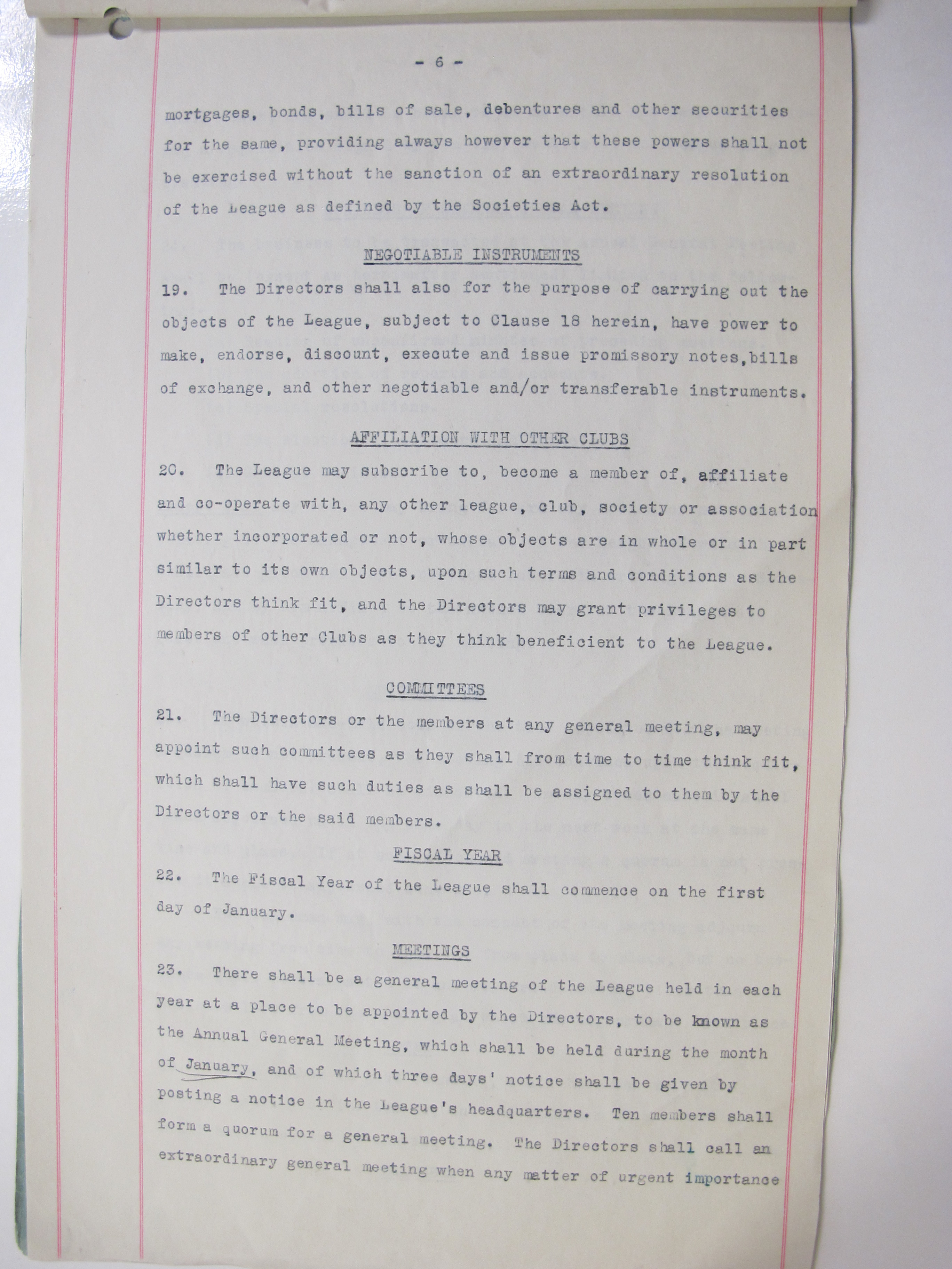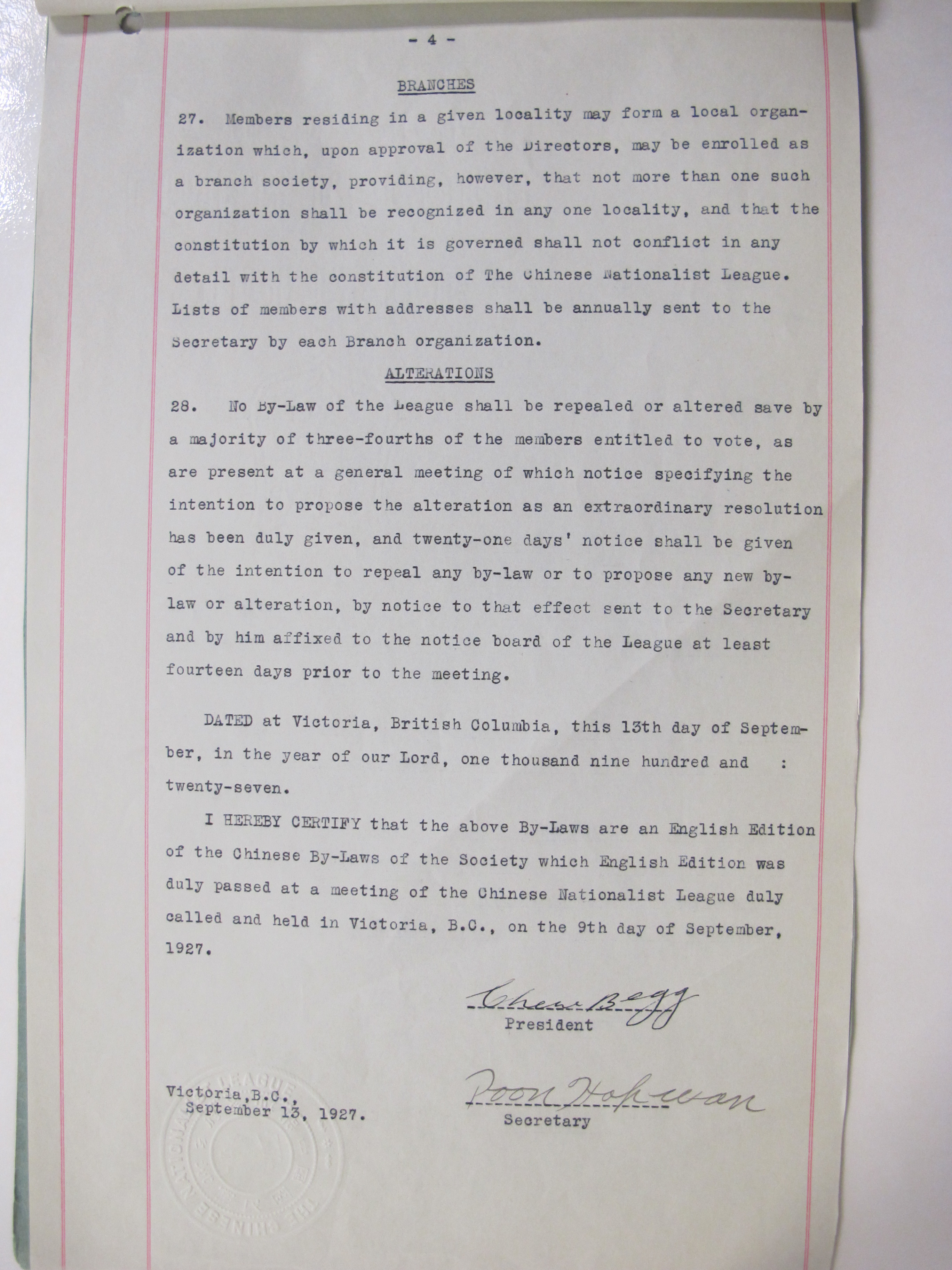 The bylaws describe the objectives, membership requirements, leadership and organization of the Chinese Nationalist League. Signed by the president and secretary and registered on 13 September 1927 by H. G. Garrett, Registrar of Companies. Identifier: BC Registry Services: Society files No. S441.