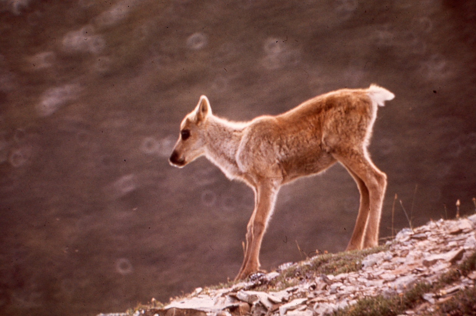 Side view of a caribou calf standing on a rocky slope. These are slides used in a boreal lecture. There are no notes for them. They appear to be Ian McTaggart-Cowan's photos.