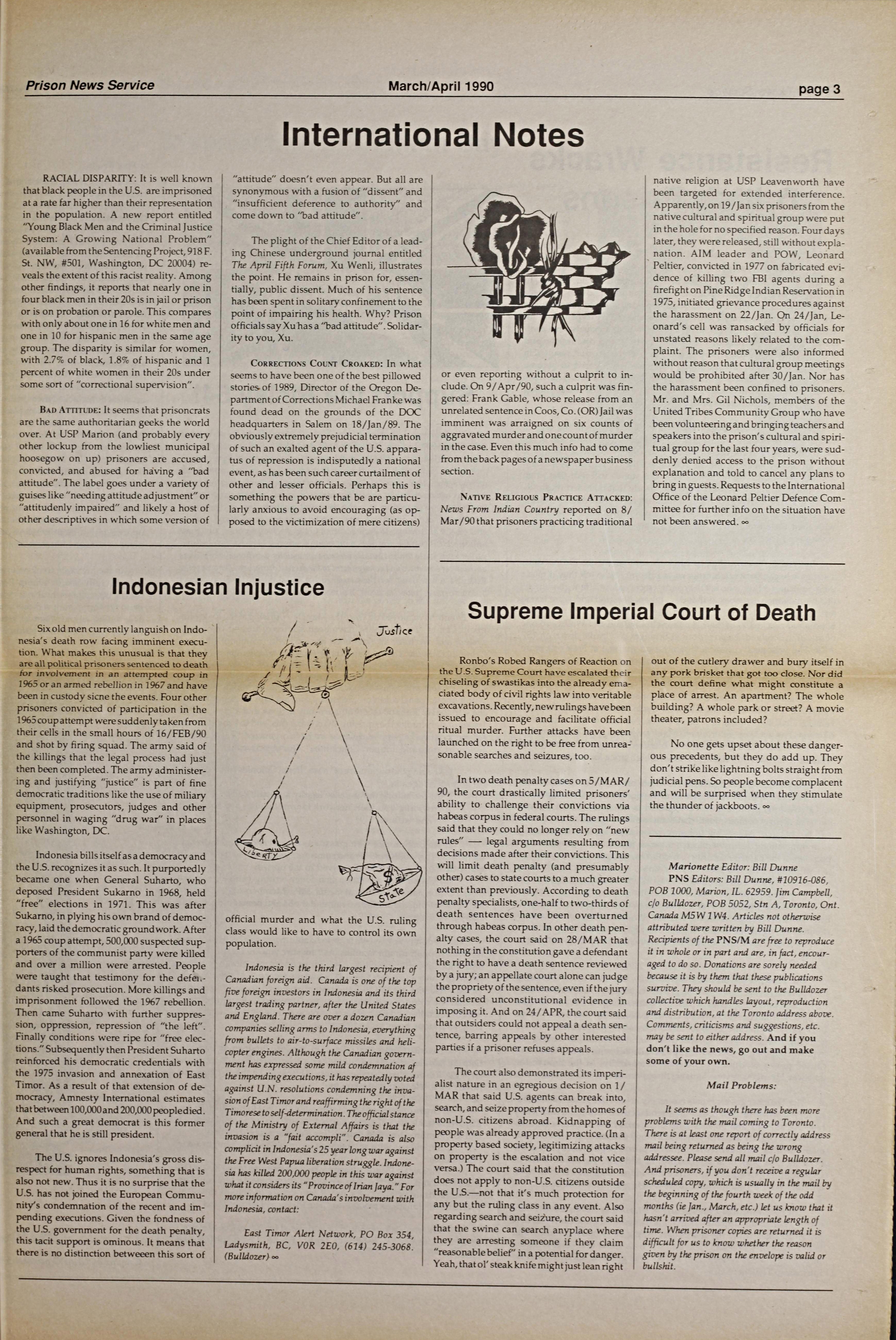 PNS editors: Bill Dunne and Jim Campbell. Article topics include: Dhoruba al-Mujahud bin Wahad (born Richard Moore, 1945) released from prison after 19 years. While incarcerated, he learned about Congressional hearings that disclosed the existence of a covert F.B.I. operation known as COINTELPRO. In December 1975 he filed a lawsuit against the F.B.I. and the police department of the City of New York. Wahad's conviction was reversed on March 15, 1990 ("Finally out" by Sekou Odinga) -- Governance dispute and deaths at Akwesasne-St Regis ("Mohawk nation divided: conflict at Akwesasne" by Bulldozer) -- Bill Dunne voices his concerns about FreeNow! movement ("Freedom now! follies) -- Open letter to the National Campaign for Amnesty and Human Rights for Political Prisoners (Freedom now) -- "Indonesian justice" discusses the plight of political prisoners sentenced to death -- The U.S. Supreme Court continues to make rulings limiting the ability of prisoners sentenced to death to appeal (Supreme imperial court of death) -- Prisoner demonstrations at Strangeways Prison in Manchester, England, the Risley Remand Center, and Clallam Bay Corrections Center. (Note: p. 4-5 is a double-page spread). Marionette, no. 48, March-April 1990. Edited by Bill Dunne. Article topics include: Political harassment -- New visiting intrusion -- "Colorado clockwork lemon" features news of the construction of the Western Correctional Complex near Florence, Colorado -- Spanish hungerstrike continues -- Leavenworth prisoners anti-death penalty fast statement (Fastathon 90, the annual fast sponsored by the National Coalition to Abolish the Death Penalty).