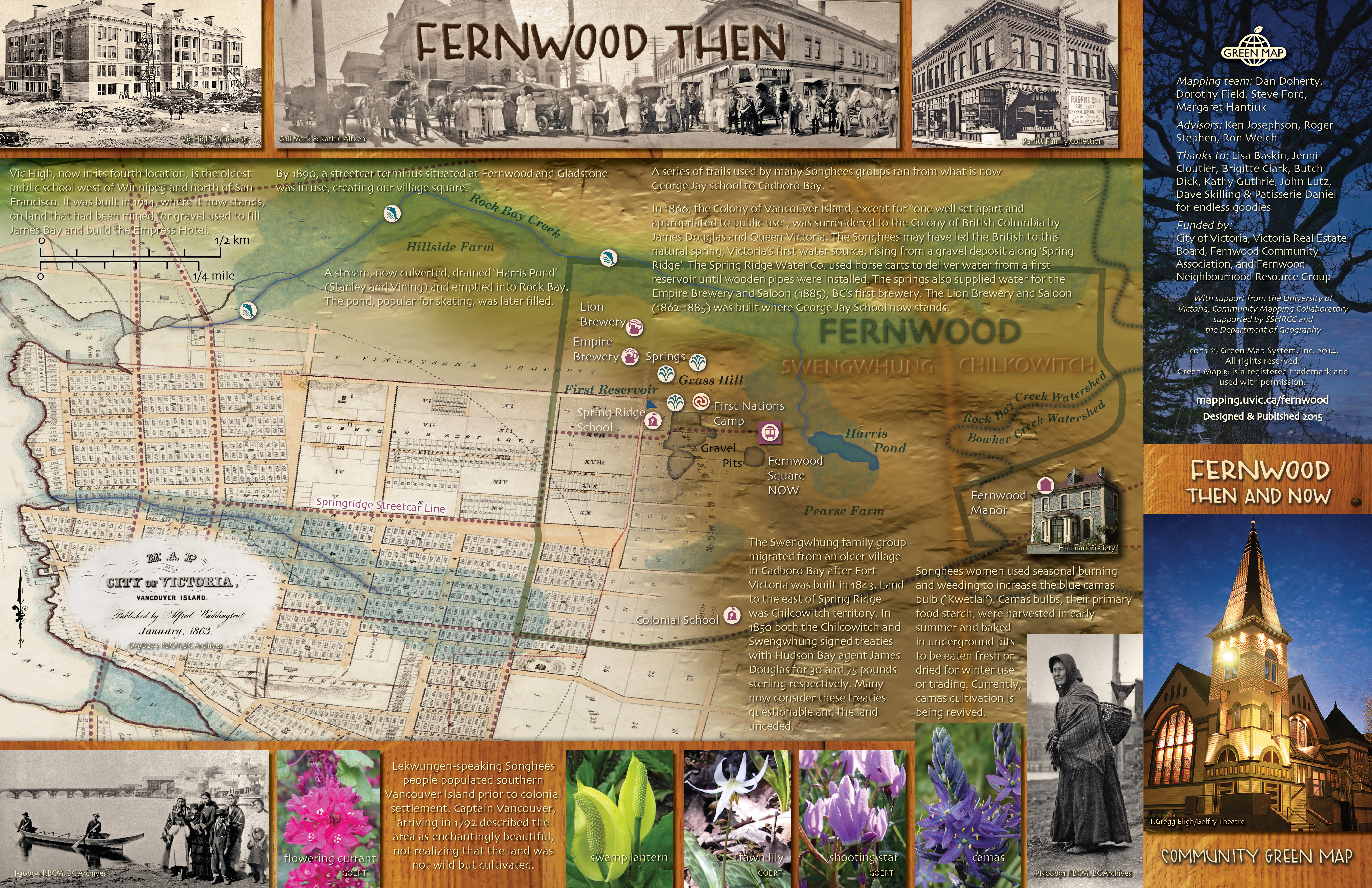A map showing the village of Fernwood today, marking food, music, art, gardens, services, and transportation. Reverse of map features historical pictures of the area; First Nations and early settler history to the region; a map from January 1863 focused on Fernwood, downtown Victoria, and surrounding areas; and pictures of flowers that were cultivated. This map is part of the Green Map System.