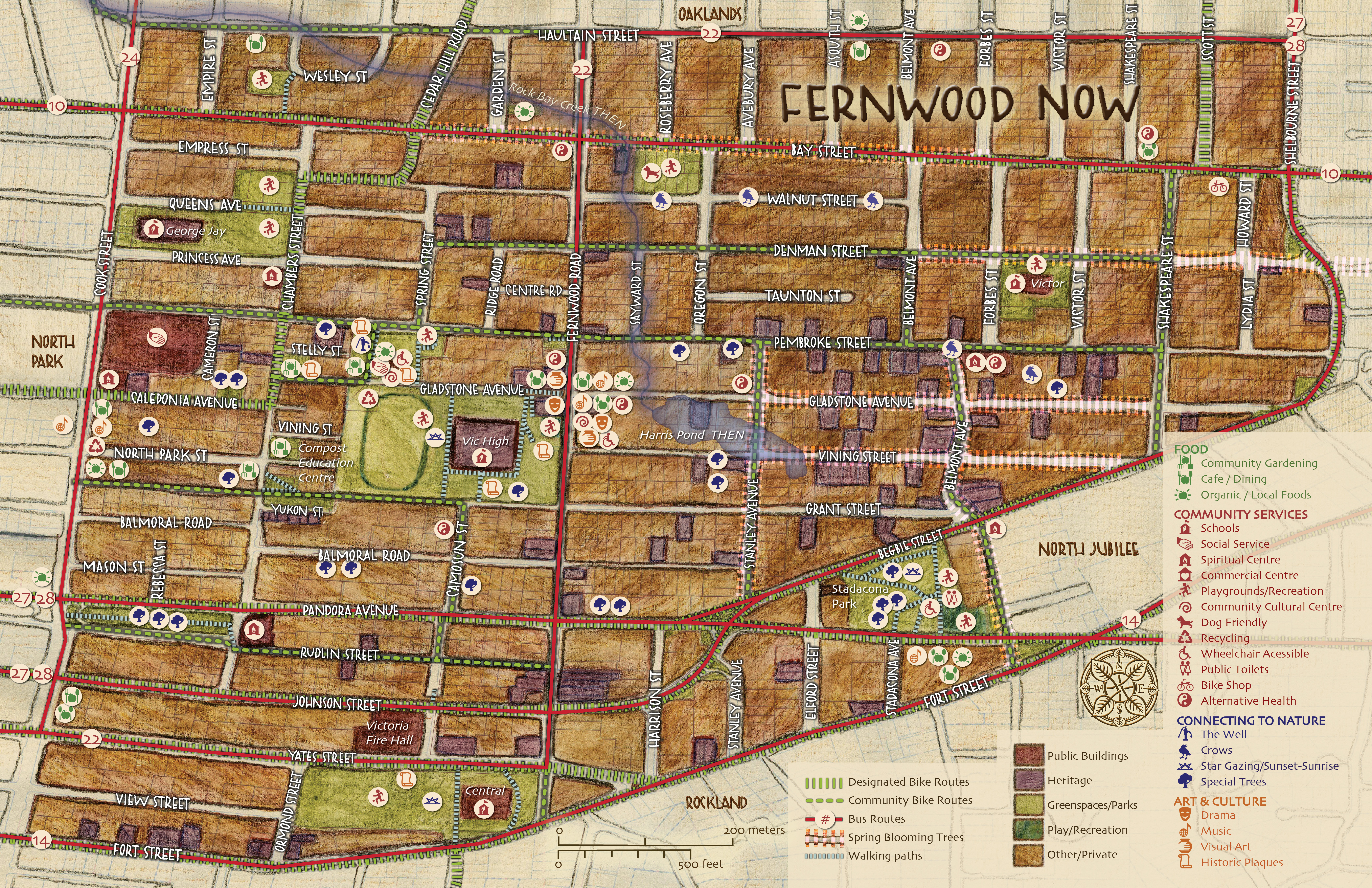 A map showing the village of Fernwood today, marking food, music, art, gardens, services, and transportation. Reverse of map features historical pictures of the area; First Nations and early settler history to the region; a map from January 1863 focused on Fernwood, downtown Victoria, and surrounding areas; and pictures of flowers that were cultivated. This map is part of the Green Map System.