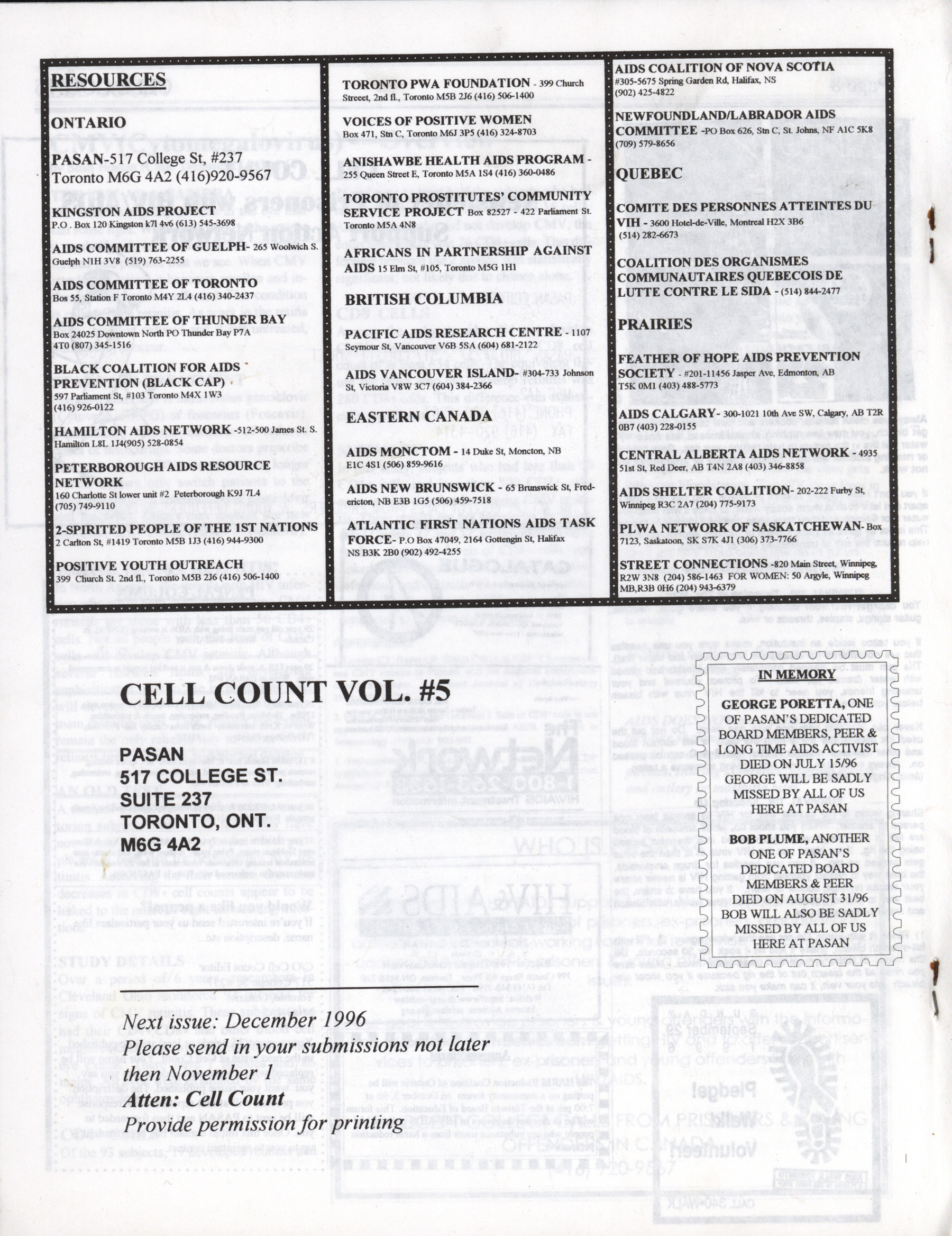 A newsletter by and for prisoners and ex-prisoners and others concerned with the crisis of HIV/AIDS in prisons. Published by PASAN (Prisoners with HIV/AIDS Support Action Network), Toronto, ON. In this issue: AIDS drug boost -- In the news: "Transvestite hooker with AIDS sentenced for biting police officer!" -- What is HIV/AIDS? -- Facts about AIDS and HIV infection in women -- Durval's story -- CMV (Cytomegalovirus) overview -- How to clean a fit -- Resources.