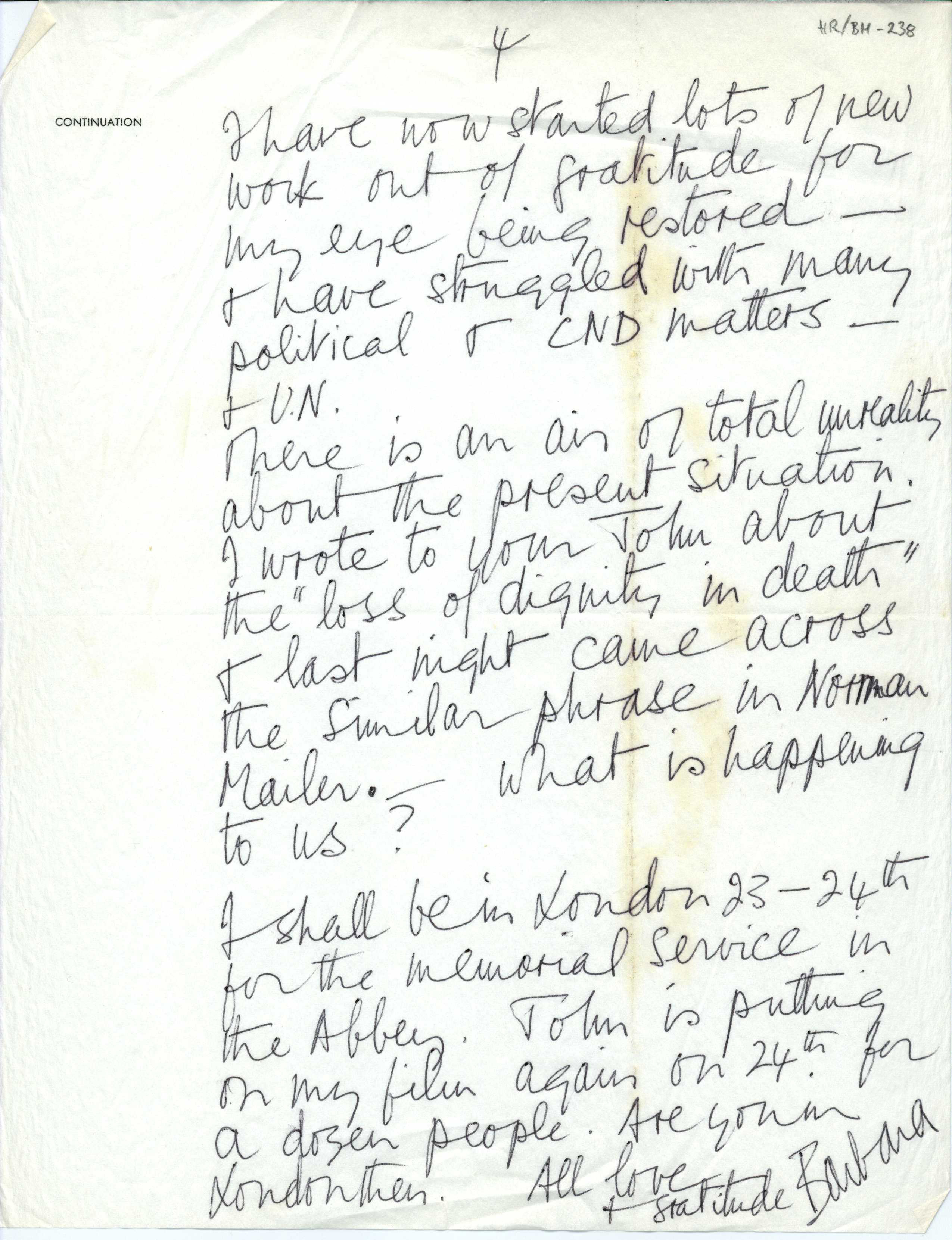 Part of a collection of letters to Sir Herbert Read from Dame Barbara Hepworth (English artist and sculptor and, along with Read, a member of the modern art movement Unit One founded by Paul Nash), that span the time period of 1940 to 1965 and discuss their artistic and literary endeavors, philosophical and political views, and personal lives. Hepworth thanks Read and his wife Ludo for their visit to St. Ives.