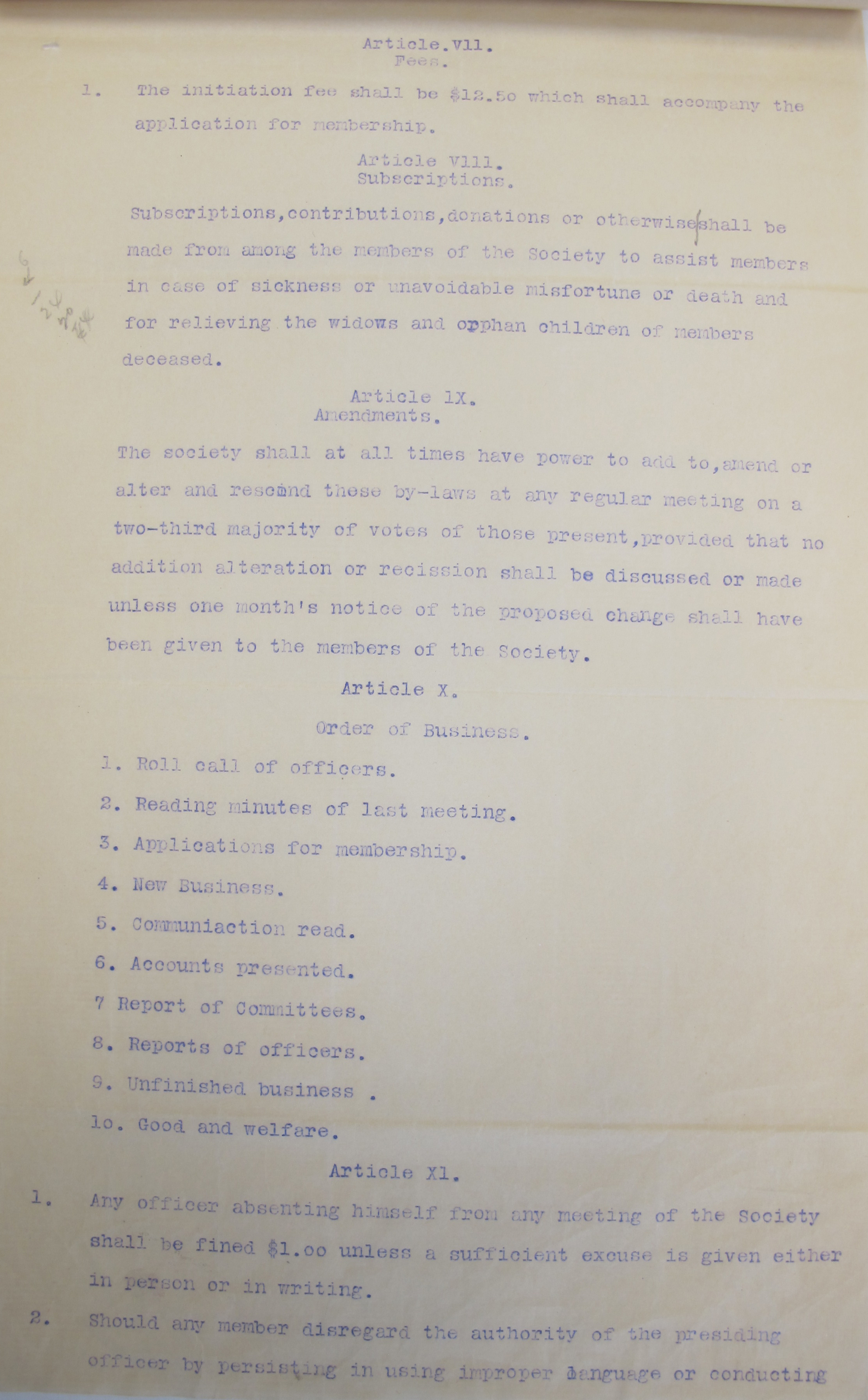 Shows bylaws of the Chee Kong Tong Society adopted on 4 July 1908. Signed by the president and secretary of the society. Identifier: BC Archives: No. 880056-4508-S200.