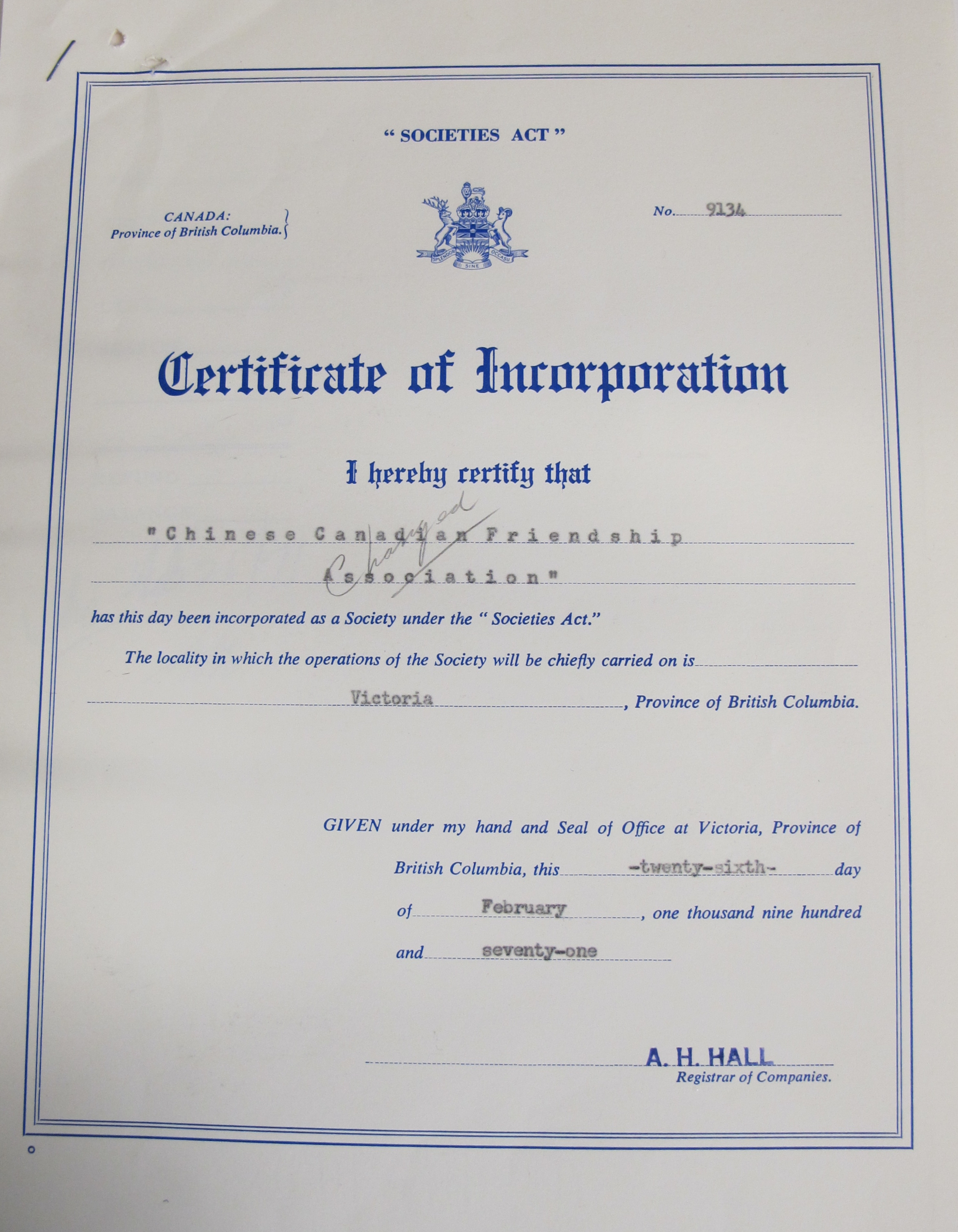 This is a certificate of incorporation of the Chinese Canadian Friendship Association, registered on 26 February 1971 by A. H. Hall, Registrar of Companies. The name was changed to Chinese Canadian Cultural Association in 1982. Identifier: Society files No. S9134.