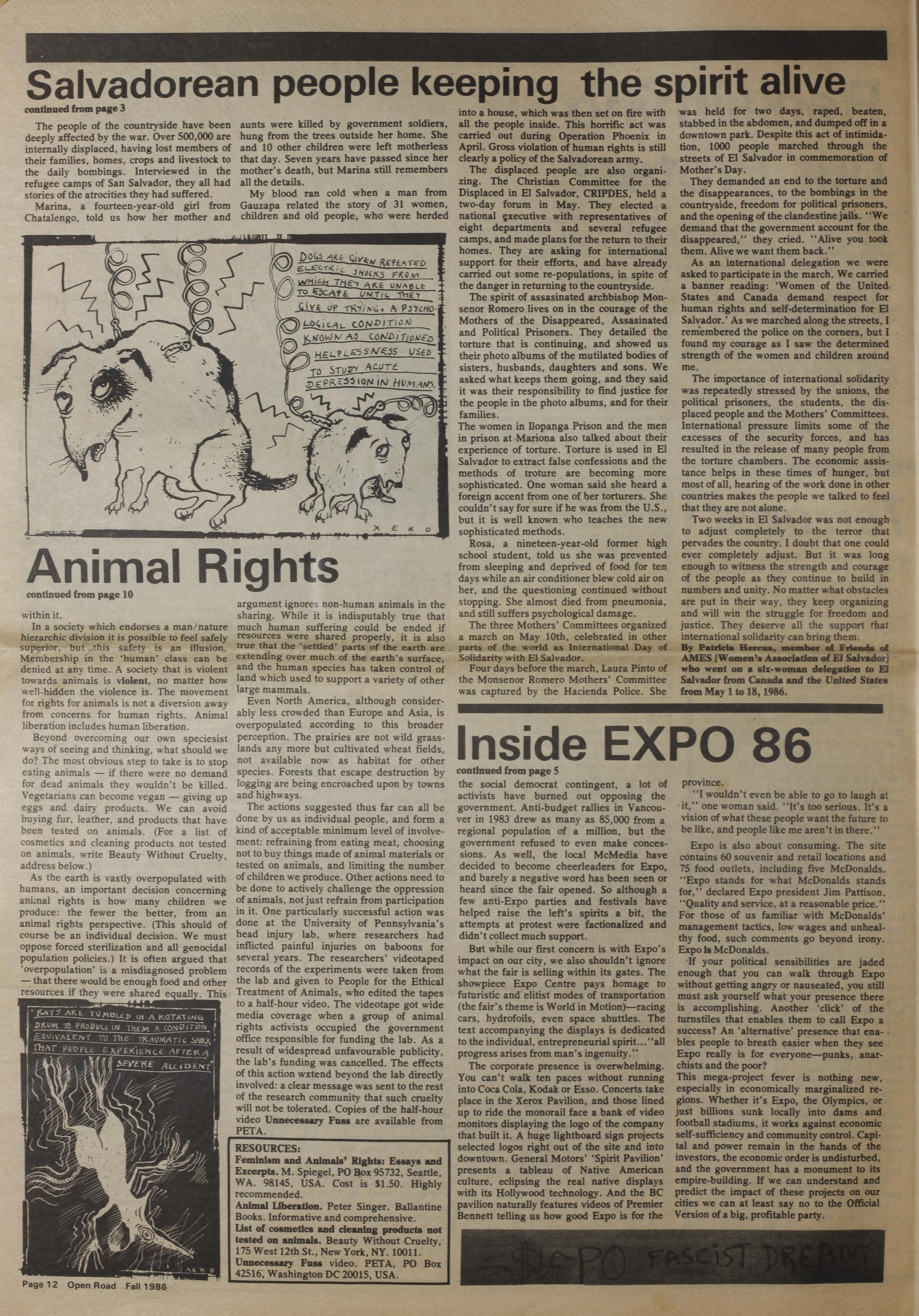 In this issue: Anarchist news. "U.S. invades Yakima Nation"; "Belgian libertarian held in solitary"; "Squatters' daycare harassed by council"; Wackersdorf protest widens"; "Greece: the struggle continues"; "Editor arrested"; "Independent label goes to court". Feminist childrearing. "Freeing the family"; "El Salvador: courage out of terror"; EXPO 86. "The capitalist wank-off: Expo 86". Spirituality. "Witches as warriors" by Jeniva. Big Mountain Update. "Big Mountain update"; "Facing up to racism". Feminism and animal rights. "Meat and misogyny" by Hilda McKenzie. "I was a Libyan terrorist". Porn and censorship. "Reclaiming our protest". "Herbal abortifacts". Roadside Notes.