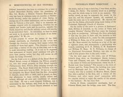 Describes Victoria, British Columbia as it was in the last half of the 19th century. Signed by Dingley Dell who wrote the included biography of Fawcett. Includes information about the author growing up in Victoria, Victoria's first Directory, history of the streets, churches, and fire department among many other topics. The plates include images of different streets, buildings, people, and scenes.