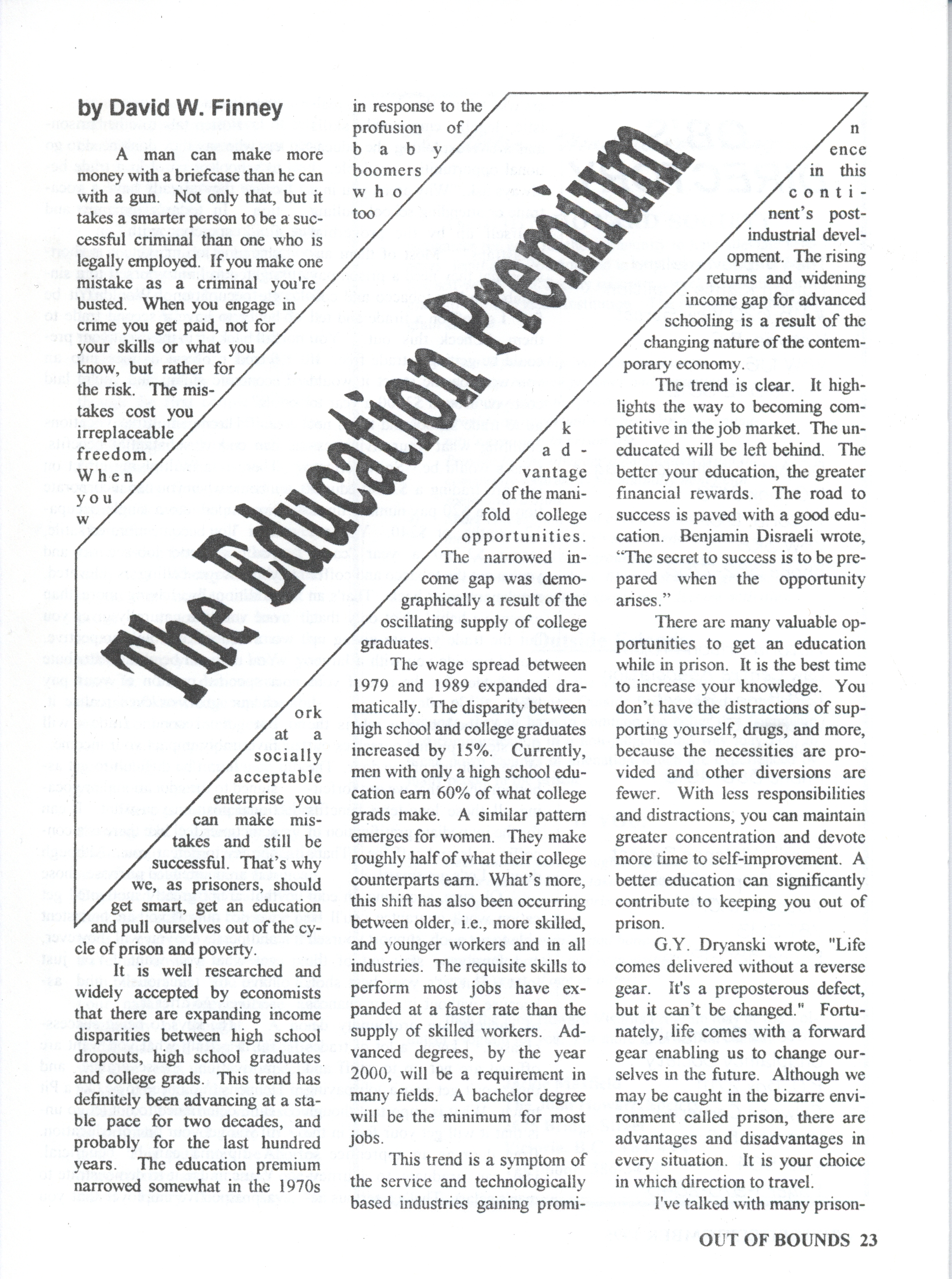Article topics include: Substance abuse programs in the Canadian prison system -- Prisons in Ontario "sniffing" for drugs on visitor's identification -- Claire Culhane and her "Claireification" column in Out of Bounds -- Prisoner's personal experience of Alcoholics Anonymous 12 step program -- PowWow at William Head -- "I'm doing time too", a prisoner's spouse speaks up -- Random urinalysis programme began June 1995 at William Head: interview with Deputy Warden Dan Denis and Coordinator of Correctional Operations Ron Magnusson -- Education the key to success in the age of information and technology -- Environmental activists: spoiled brats or committed advocates?