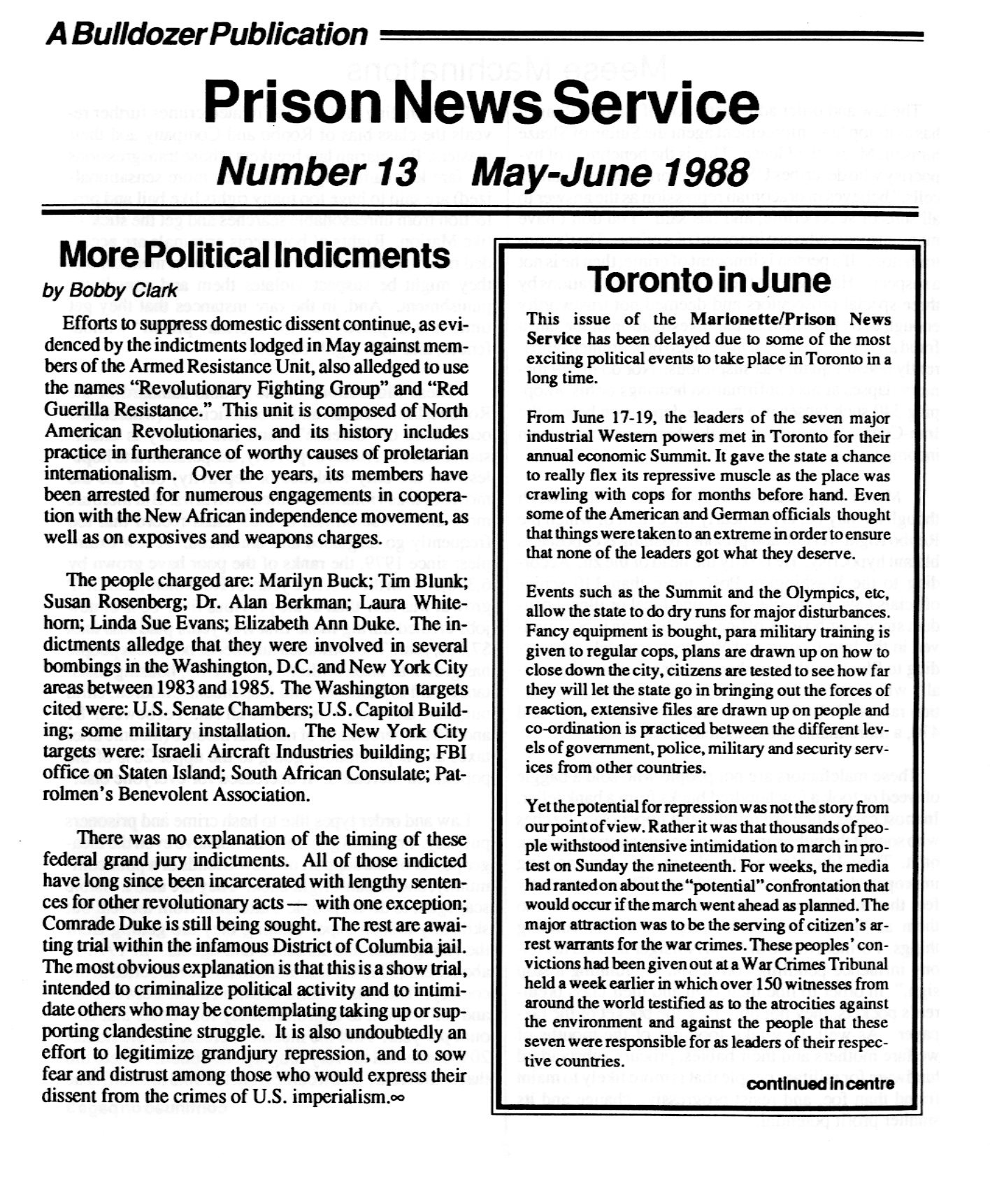 Edited by Bill Dunne. Article topics include: Marion malignancy falters at border, Heat, Marionnotes. PNS no. 13, May-June 1988. "A Bulldozer publication" Article topics include: More political indictments (by Bobby Clark), Toronto in June, Meese machinations, Court capers, Prisons or social solutions (by Kojo Samani Sabadu), Political convictions. (Note: p. 4-5 is a double page spread)