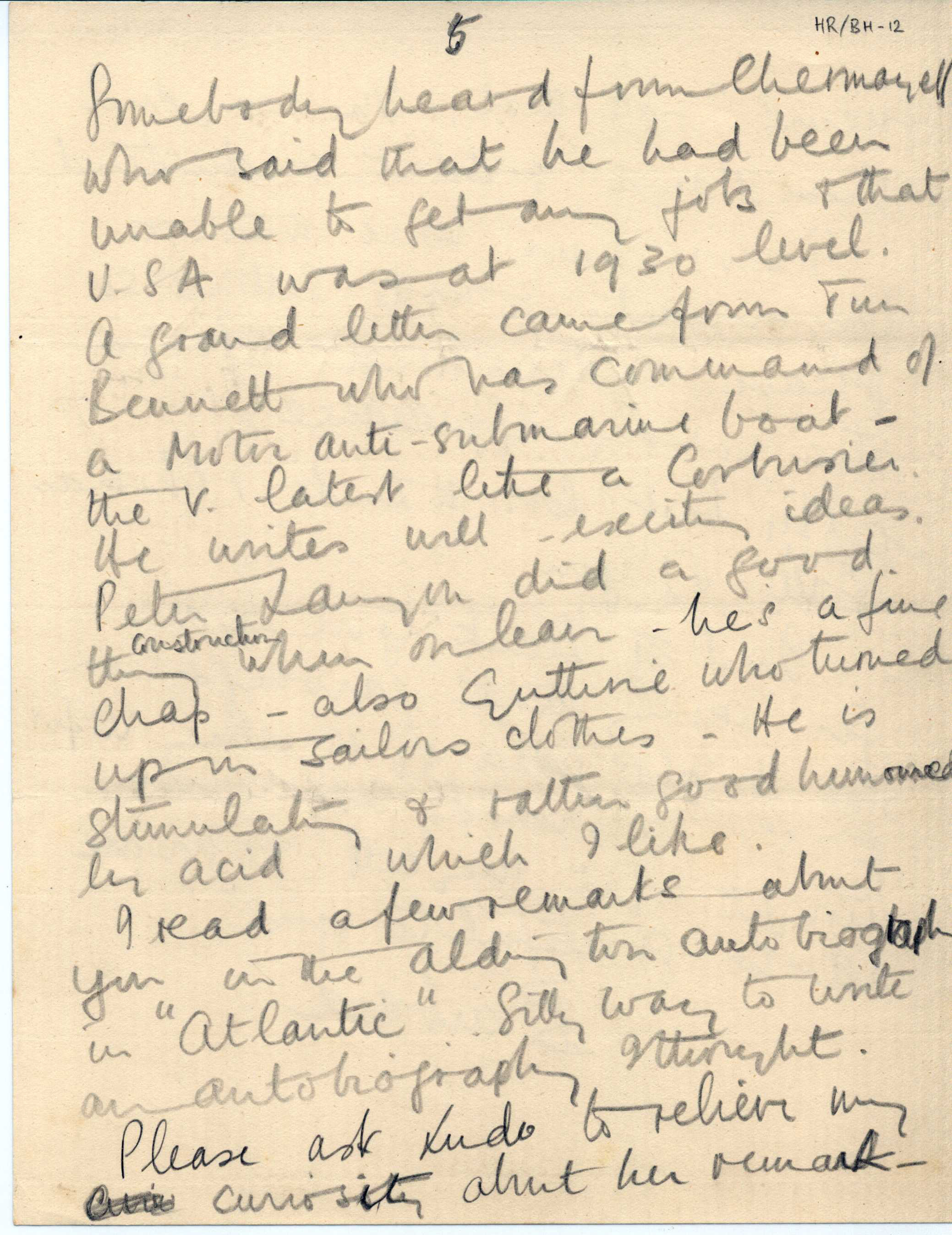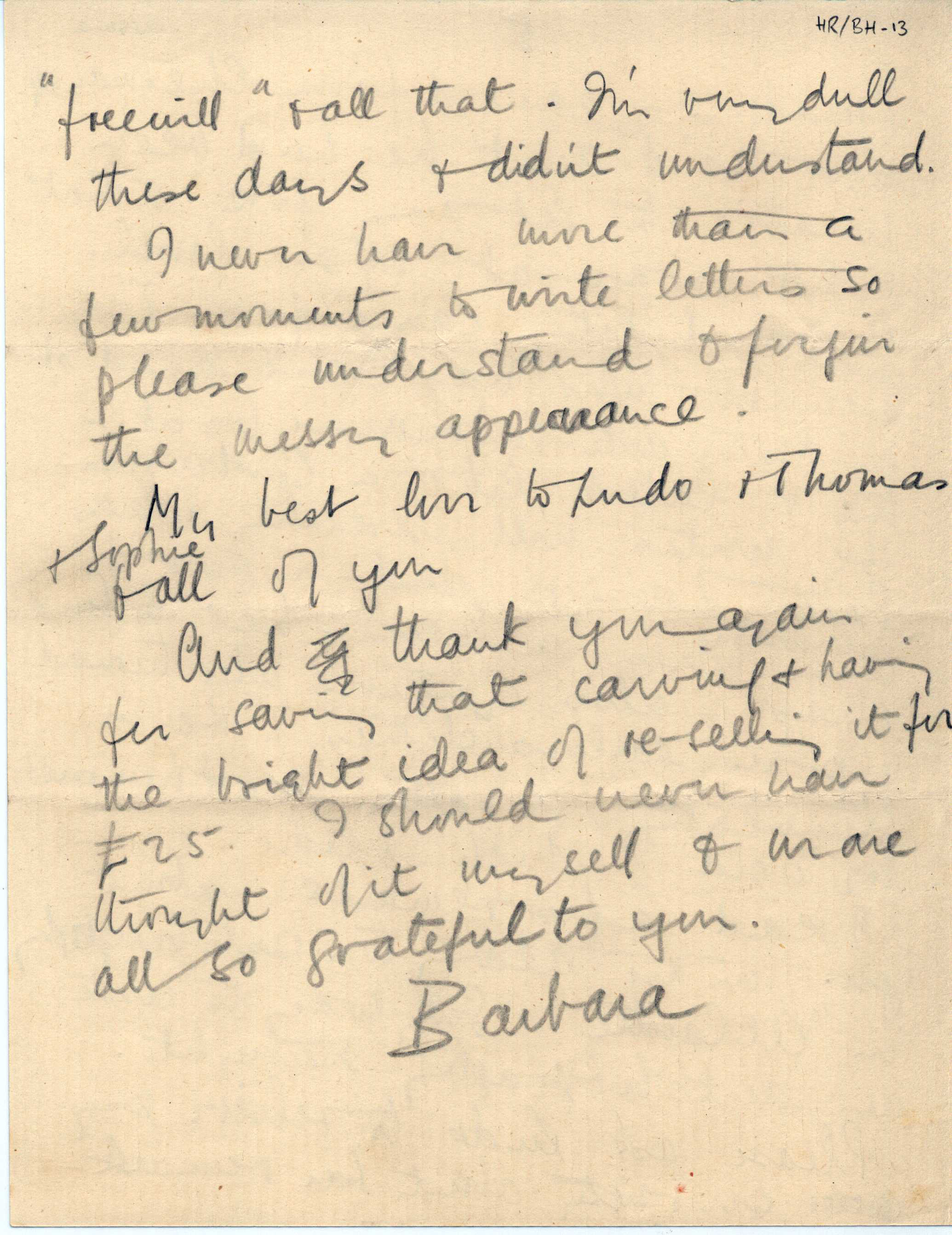 Part of a collection of letters to Sir Herbert Read from Dame Barbara Hepworth (English artist and sculptor and, along with Read, a member of the modern art movement Unit One founded by Paul Nash), that span the time period of 1940 to 1965 and discuss their artistic and literary endeavors, philosophical and political views, and personal lives. Hepworth sells a carving and receives a poem from Read. Other artists' activities are noted.
