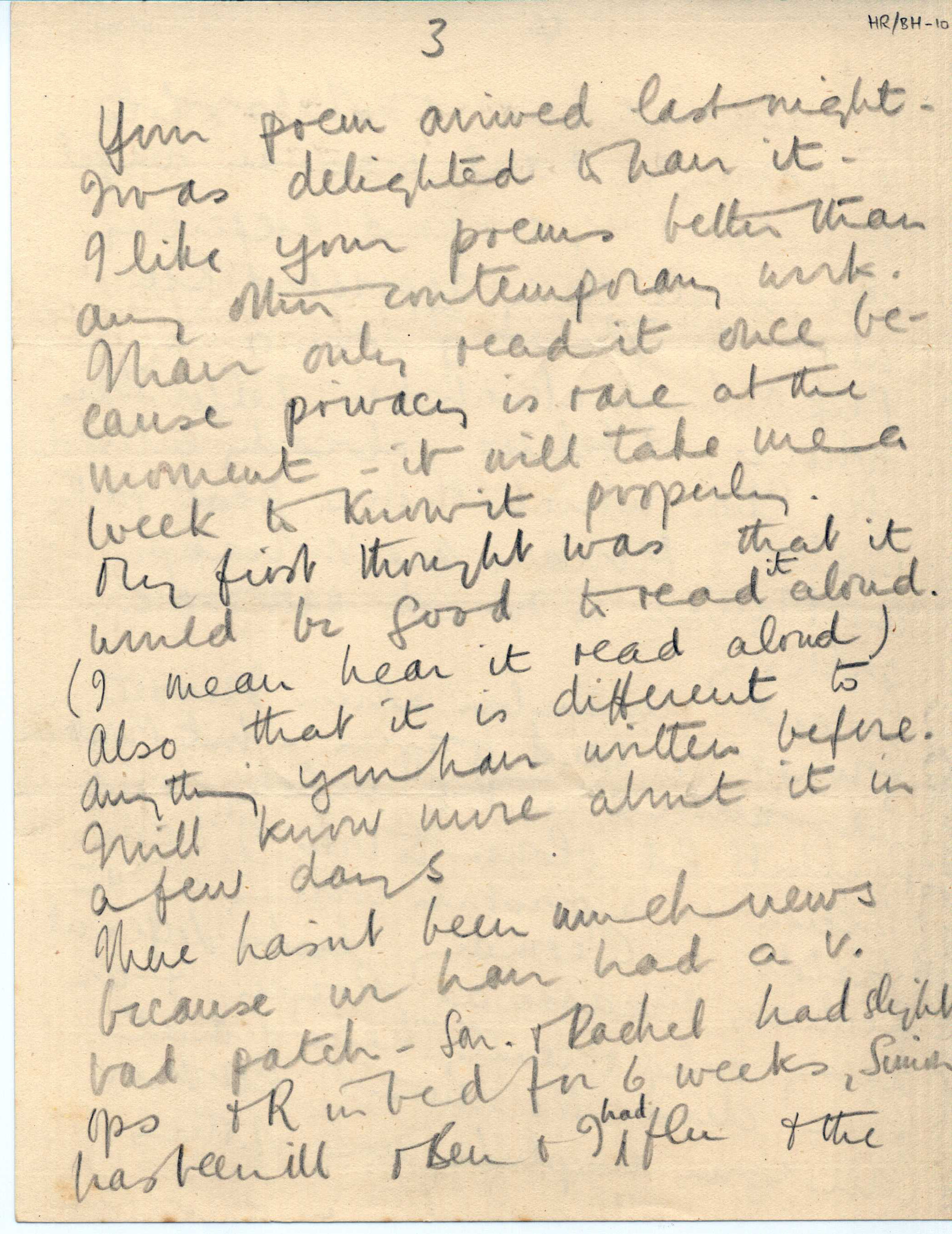 Part of a collection of letters to Sir Herbert Read from Dame Barbara Hepworth (English artist and sculptor and, along with Read, a member of the modern art movement Unit One founded by Paul Nash), that span the time period of 1940 to 1965 and discuss their artistic and literary endeavors, philosophical and political views, and personal lives. Hepworth sells a carving and receives a poem from Read. Other artists' activities are noted.