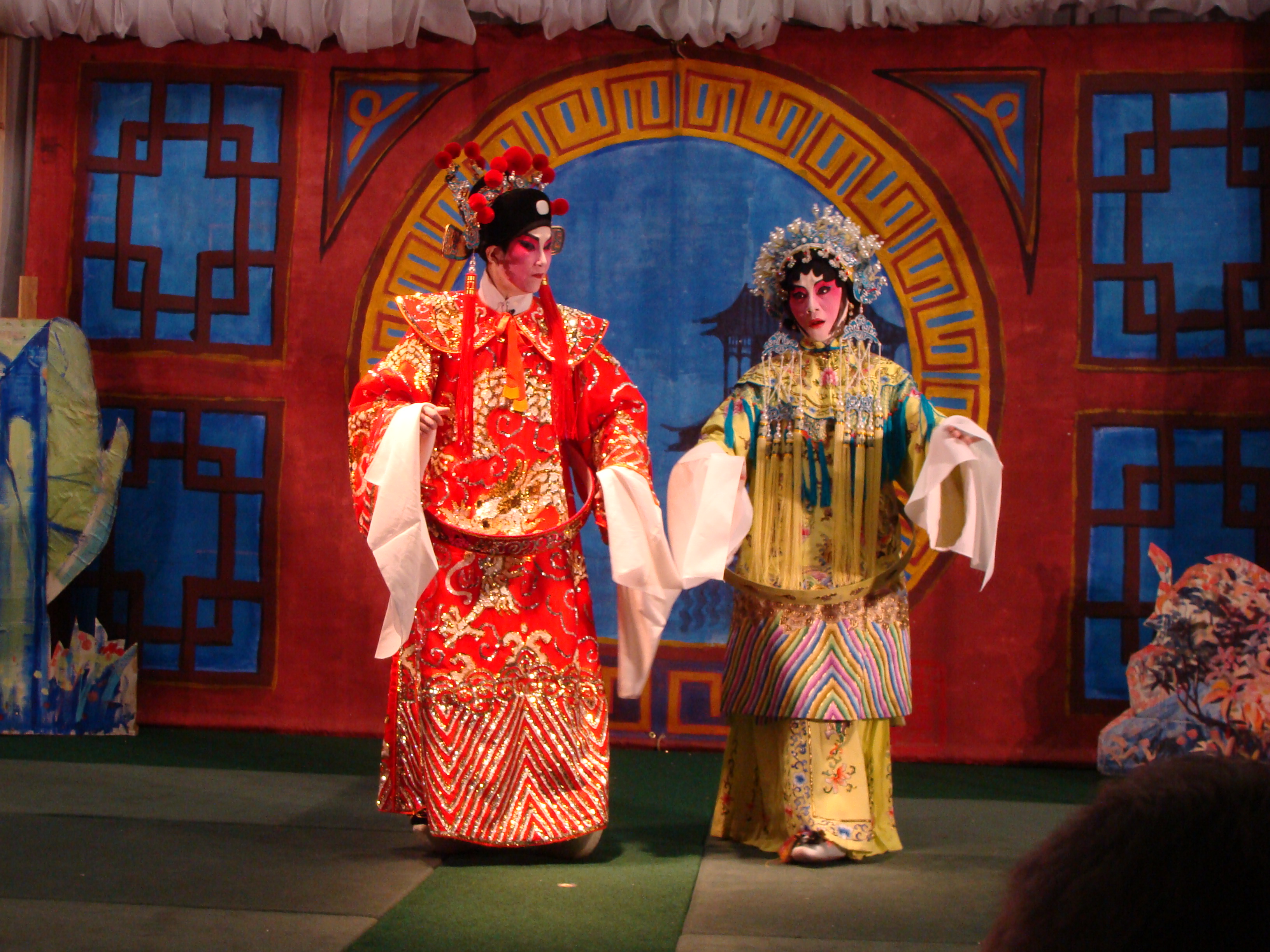 Shows two singers performing Cantonese opera at Ambrosia show room in 2010. Cantonese opera is one of the major categories in Chinese opera. One of 5 images from Gum Sing Opera performance.