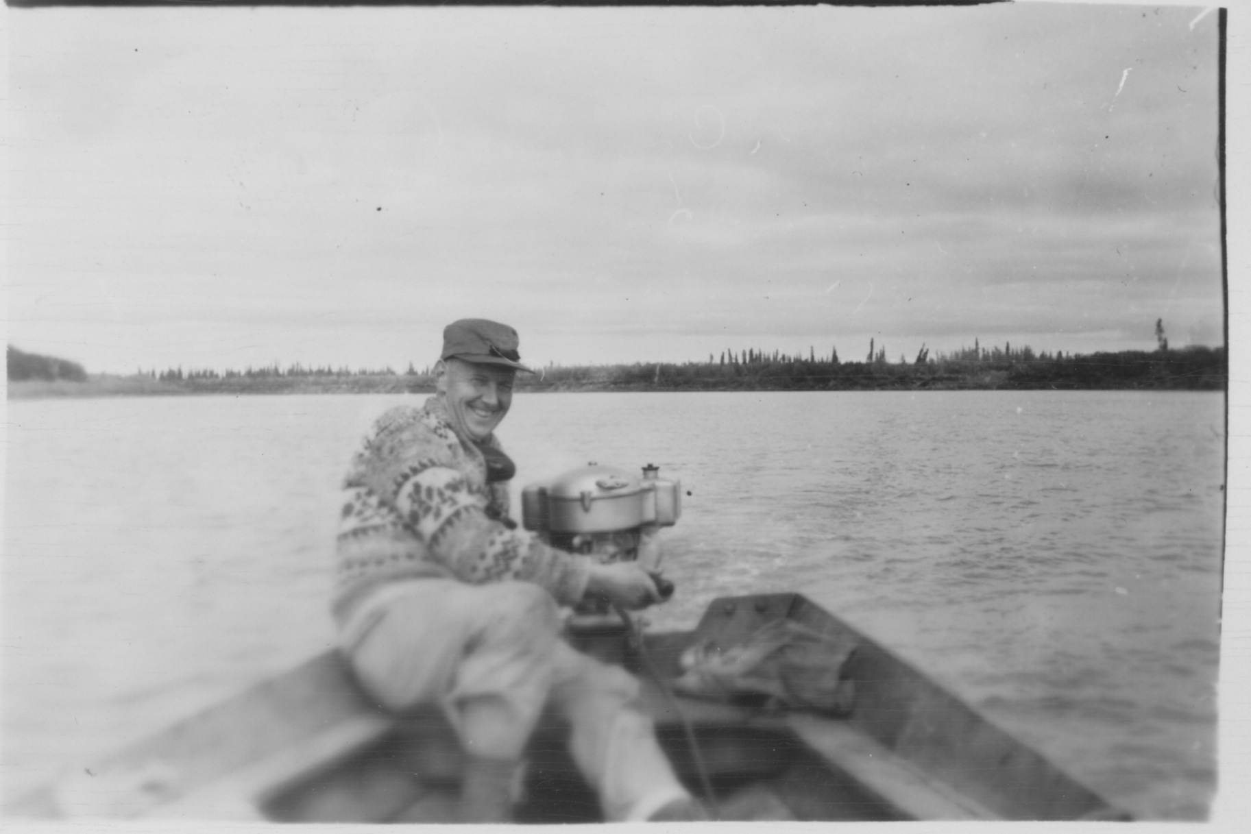 Ian McTaggart-Cowan in the back of a boat in the Mackenzie Delta.