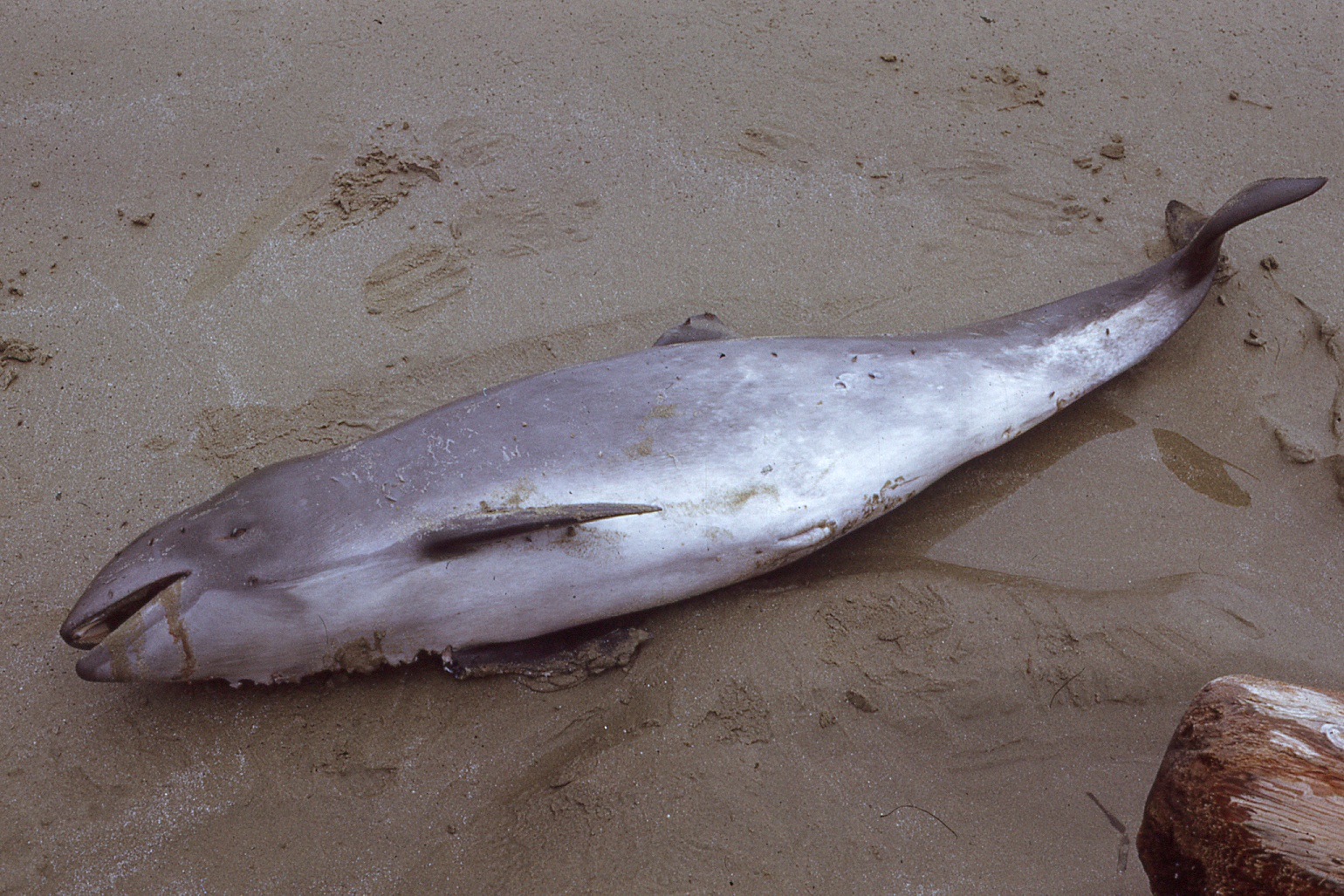 A beached harbour porpoise. (Family: phocoenidae; binomial name: phocoena phocoena).