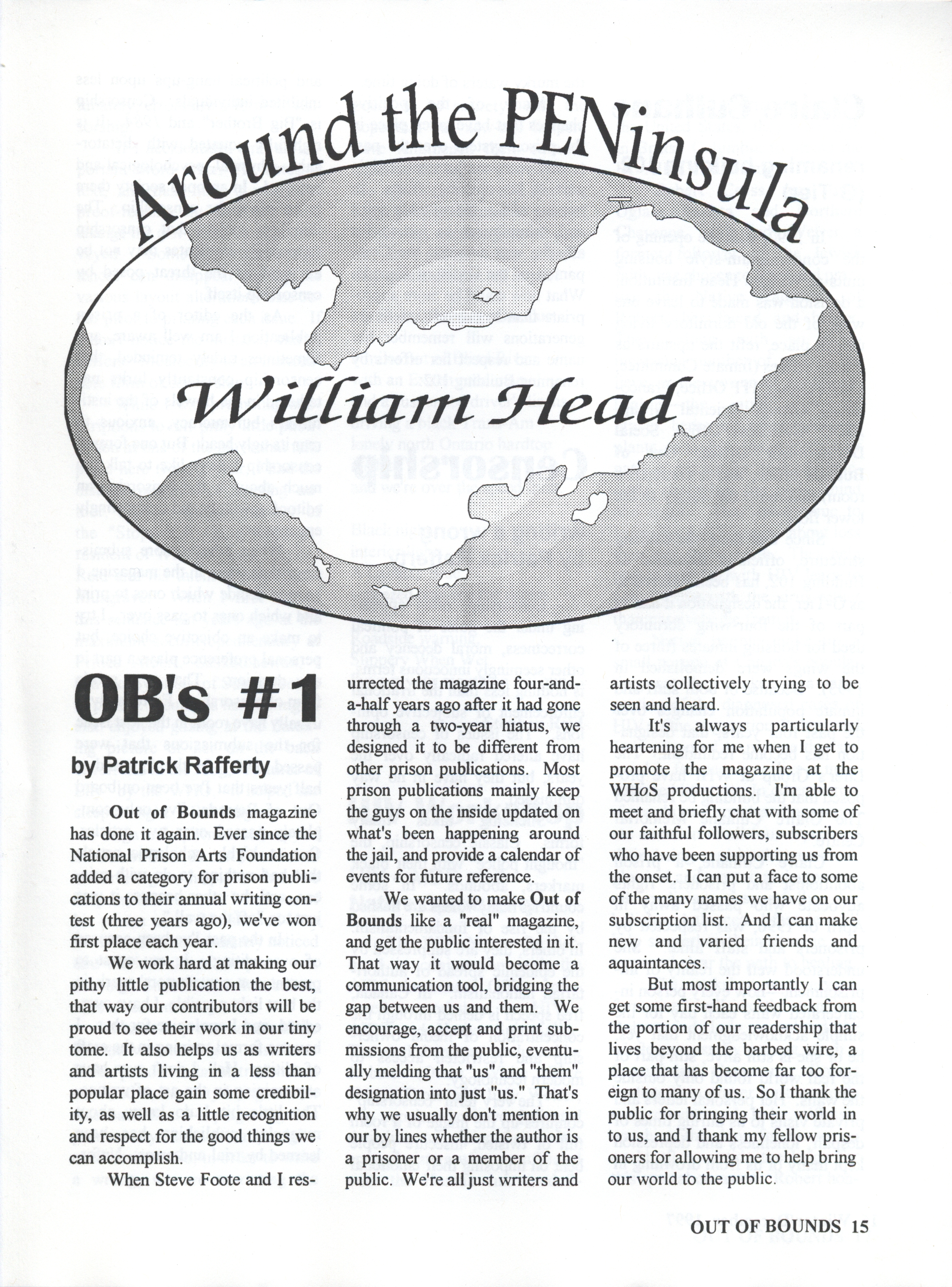 A non-profit quarterly publication of the thoughts, feelings, and distinct perspectives of prisoners and visitors by the prisoners at William Head Institution in Victoria, B.C. with the aim of providing a different view to the general public. Edited by Patrick W. Rafferty.