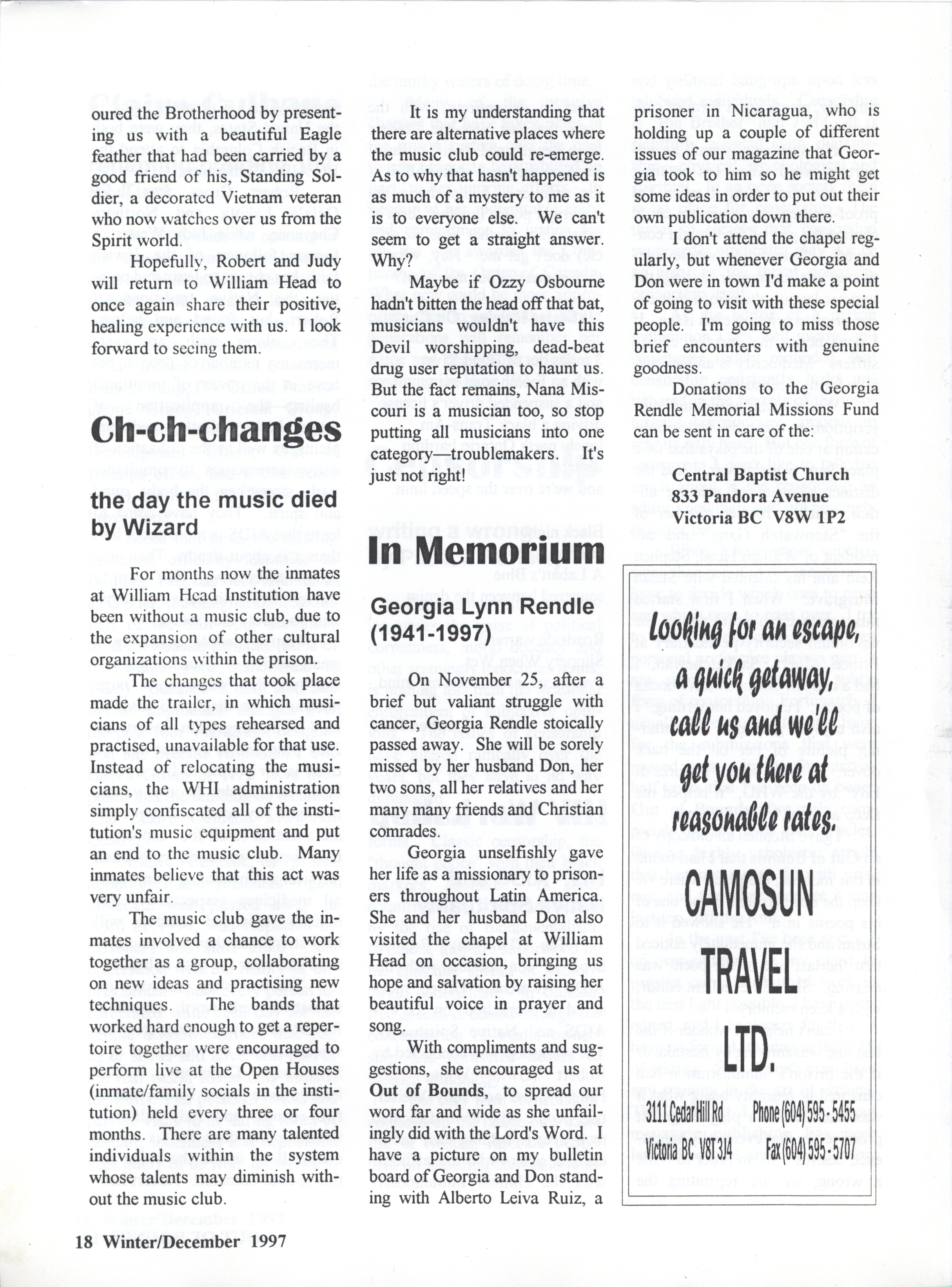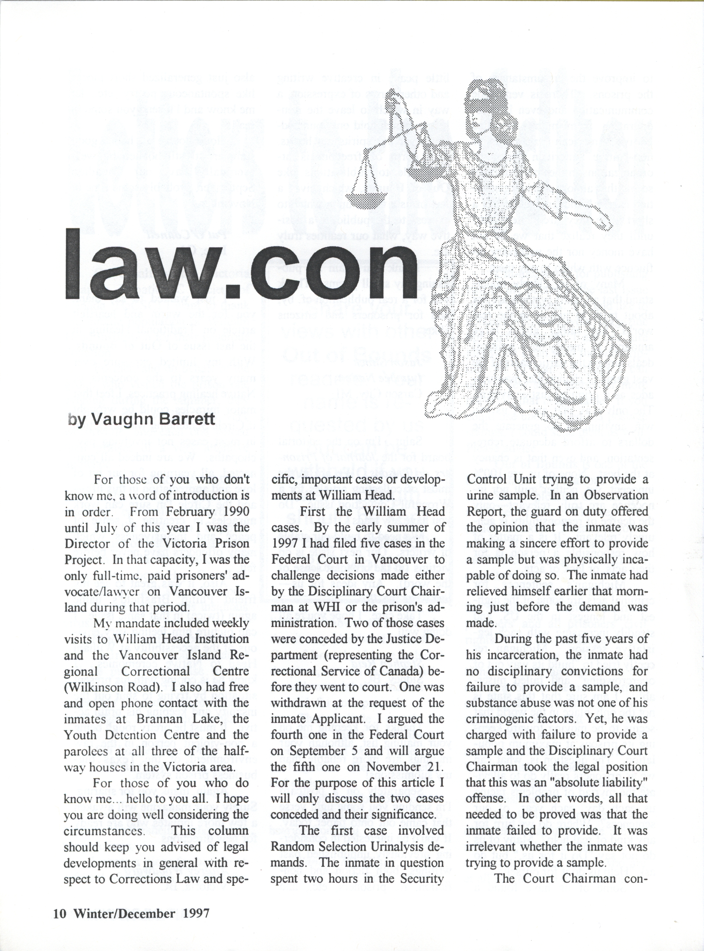 A non-profit quarterly publication of the thoughts, feelings, and distinct perspectives of prisoners and visitors by the prisoners at William Head Institution in Victoria, B.C. with the aim of providing a different view to the general public. Edited by Patrick W. Rafferty.