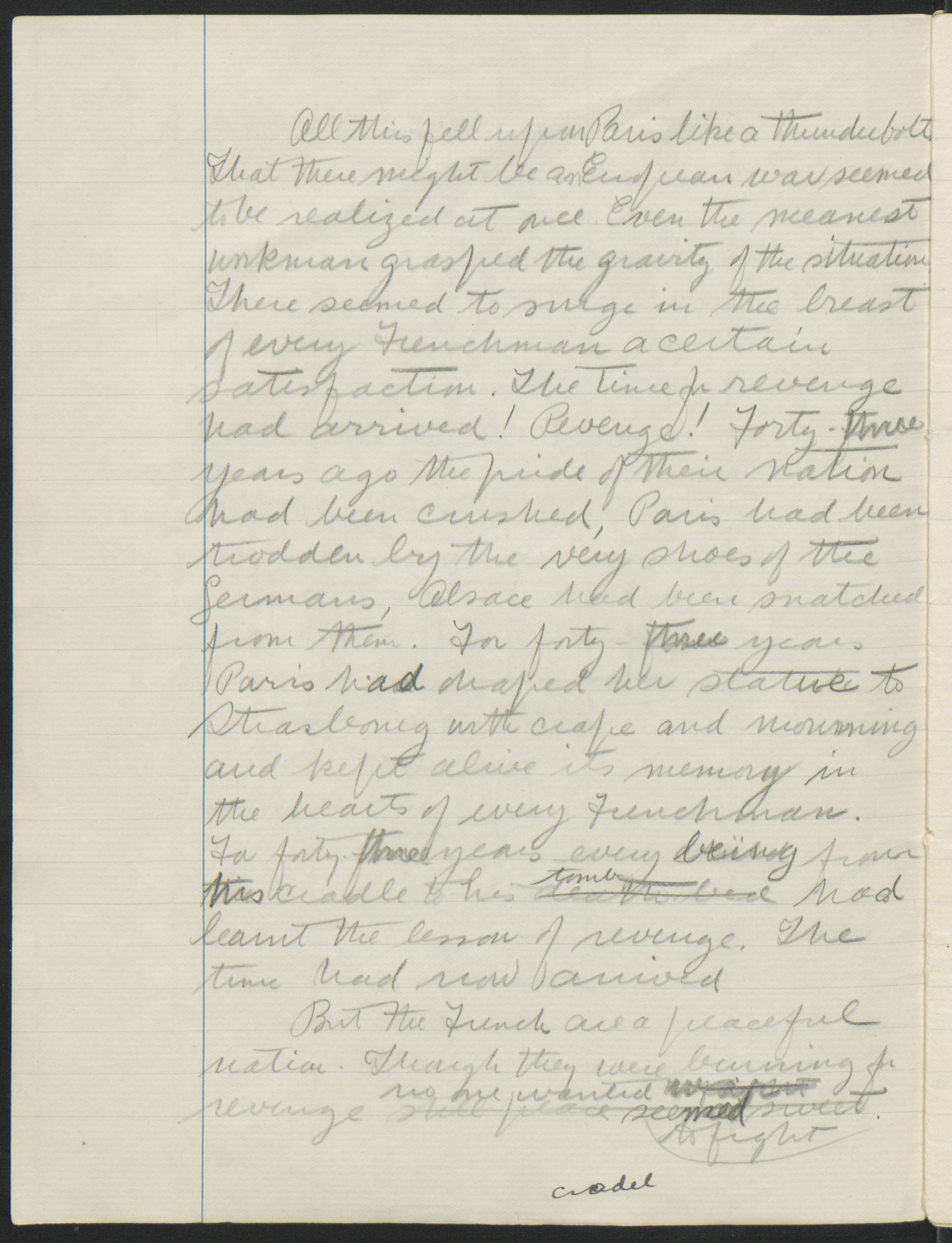 A diary written by Joseph B. Clearihue in Paris, France during the period of August to September 5, 1914. The diary covers Clearihue's experiences as a civilian at the beginning of World War I, while he was studying French in Paris. Biography: Joseph Badenoch Clearihue was born in Victoria and attended Boys' Central School and Victoria High School before enrolling at Victoria College (graduated in 1903), McGill University and Oxford University. He enjoyed a long career as a student, a soldier in the Fifth Canadian Field Artillery Unit in World War I, a Liberal MLA and Victoria alderman, and as a lawyer before being appointed a county court judge in 1952. He was Chair of the Victoria College Council (1947-63), and guided the College to university status. In January 1962, Clearihue turned the first sod at the construction site of the Clearihue Building, which was the first building on the Gordon head campus. Clearihue was also the first Chancellor of the University of Victoria, and Chair of the Board of Governors (1963-66).