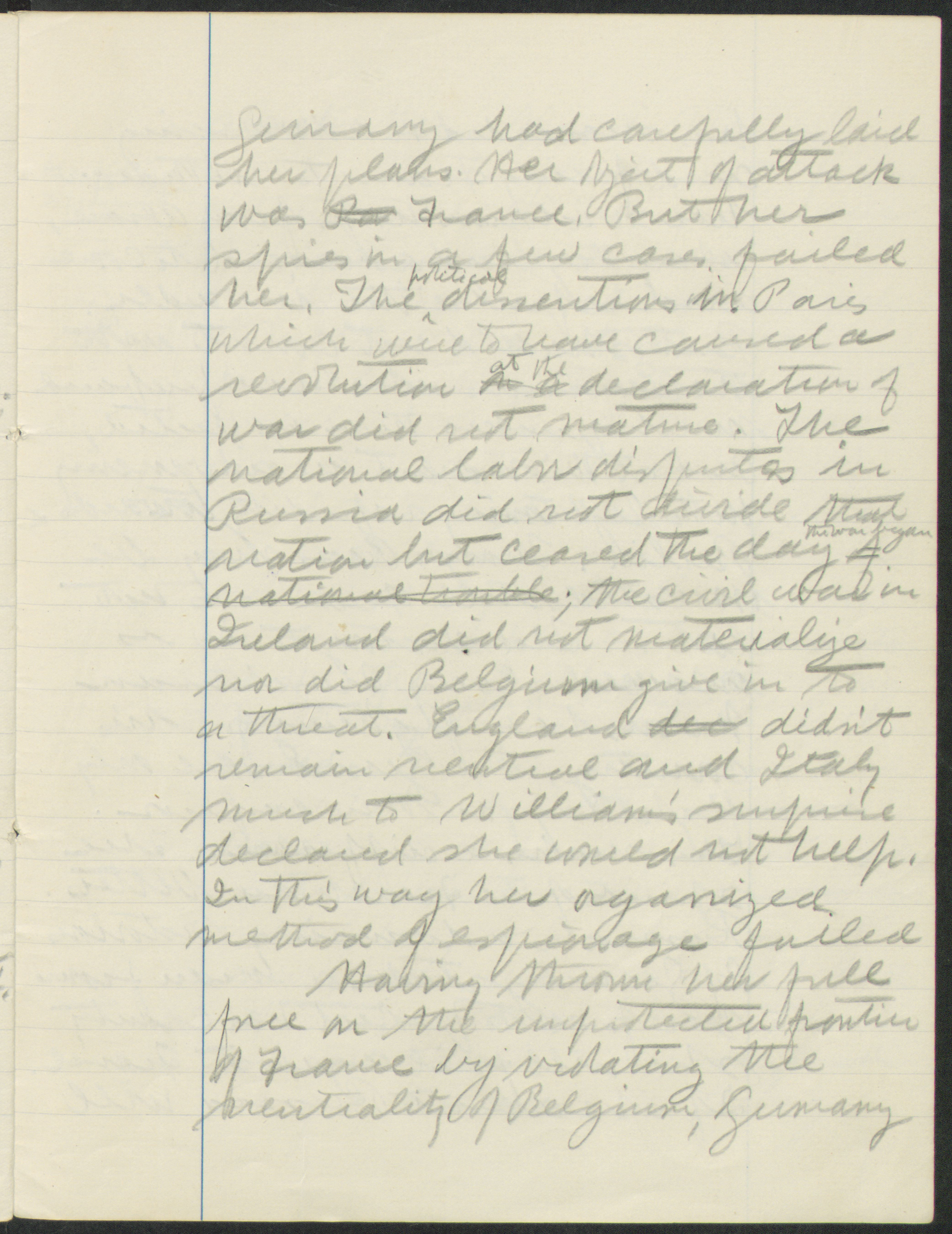 A diary written by Joseph B. Clearihue in Paris, France during the period of August to September 5, 1914. The diary covers Clearihue's experiences as a civilian at the beginning of World War I, while he was studying French in Paris. Biography: Joseph Badenoch Clearihue was born in Victoria and attended Boys' Central School and Victoria High School before enrolling at Victoria College (graduated in 1903), McGill University and Oxford University. He enjoyed a long career as a student, a soldier in the Fifth Canadian Field Artillery Unit in World War I, a Liberal MLA and Victoria alderman, and as a lawyer before being appointed a county court judge in 1952. He was Chair of the Victoria College Council (1947-63), and guided the College to university status. In January 1962, Clearihue turned the first sod at the construction site of the Clearihue Building, which was the first building on the Gordon head campus. Clearihue was also the first Chancellor of the University of Victoria, and Chair of the Board of Governors (1963-66).