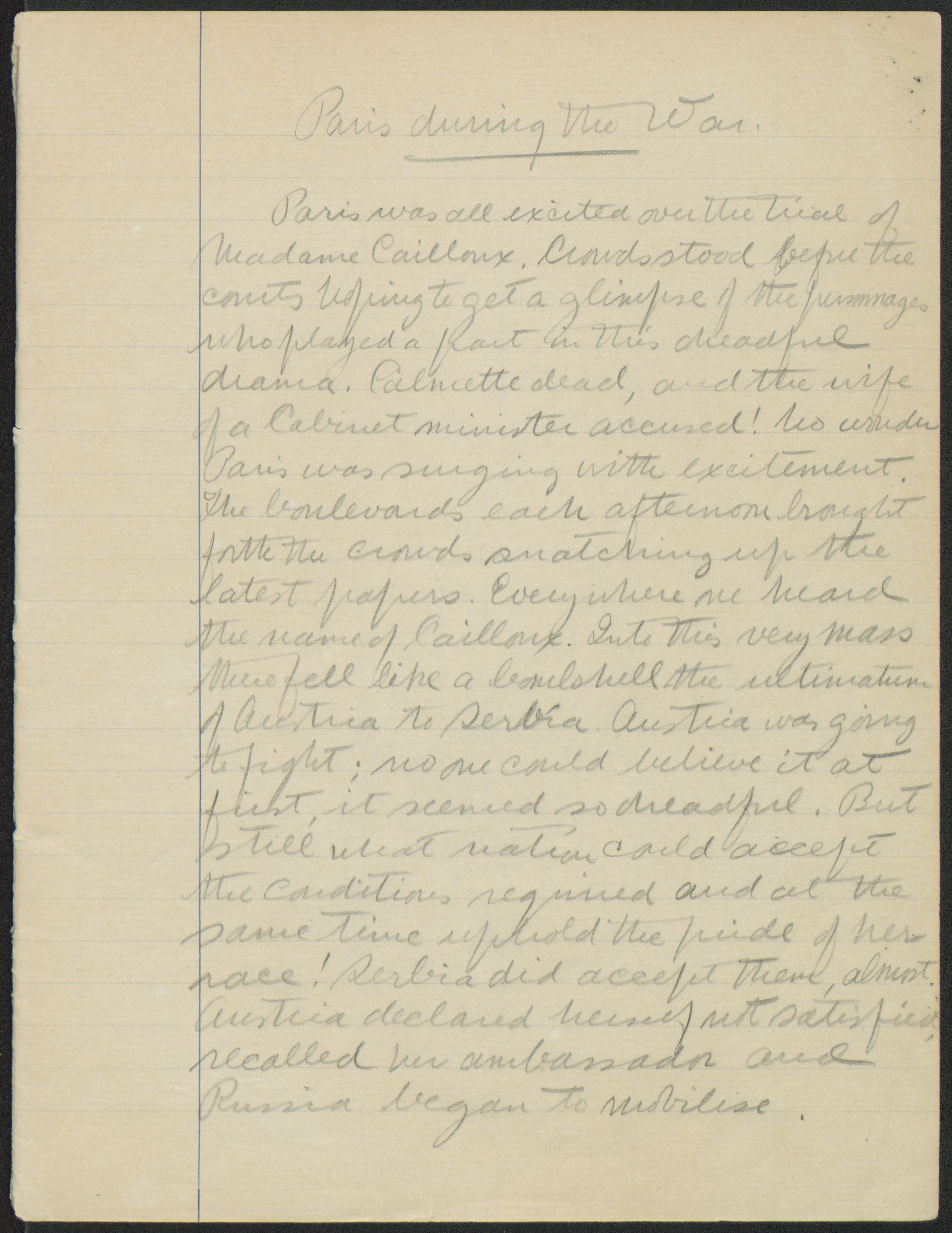 A diary written by Joseph B. Clearihue in Paris, France during the period of August to September 5, 1914. The diary covers Clearihue's experiences as a civilian at the beginning of World War I, while he was studying French in Paris. Biography: Joseph Badenoch Clearihue was born in Victoria and attended Boys' Central School and Victoria High School before enrolling at Victoria College (graduated in 1903), McGill University and Oxford University. He enjoyed a long career as a student, a soldier in the Fifth Canadian Field Artillery Unit in World War I, a Liberal MLA and Victoria alderman, and as a lawyer before being appointed a county court judge in 1952. He was Chair of the Victoria College Council (1947-63), and guided the College to university status. In January 1962, Clearihue turned the first sod at the construction site of the Clearihue Building, which was the first building on the Gordon head campus. Clearihue was also the first Chancellor of the University of Victoria, and Chair of the Board of Governors (1963-66).