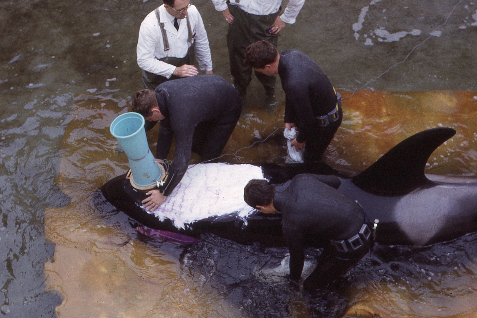People measuring exhalation of Skana, a killer whale (orca). Skana was a female killer whale and captured on February 15, 1967 off Yukon Harbor. She was sent to Seattle Marine Aquarium where she was given basic training and sold to Vancouver Aquarium. She died on October 5, 1980.