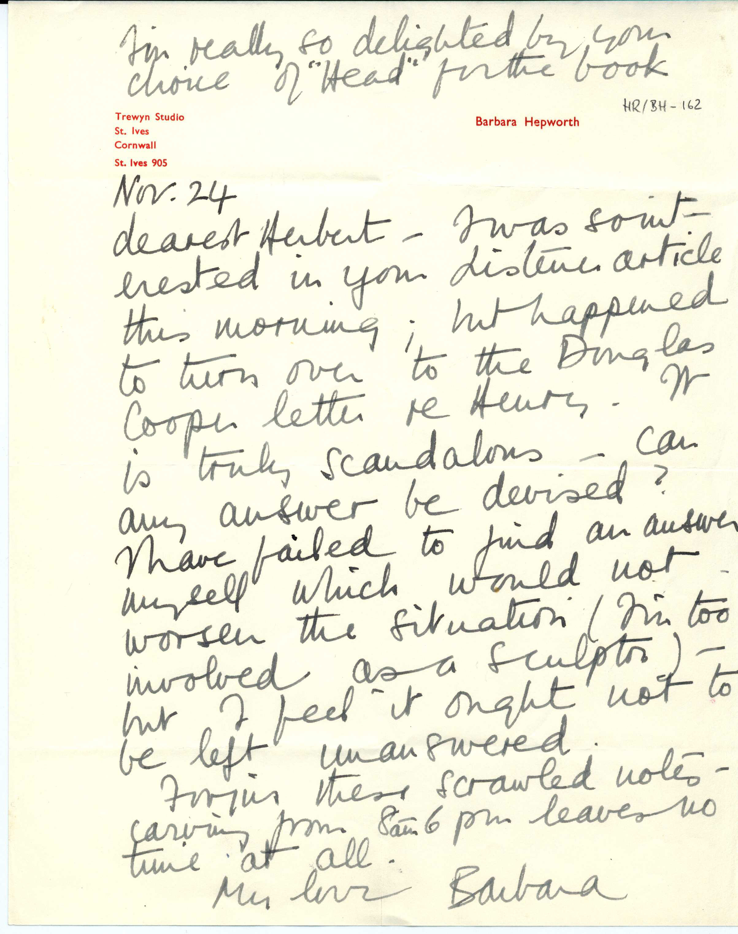 Letter from Barbara Hepworth to Herbert Read, November 24, [1955?]