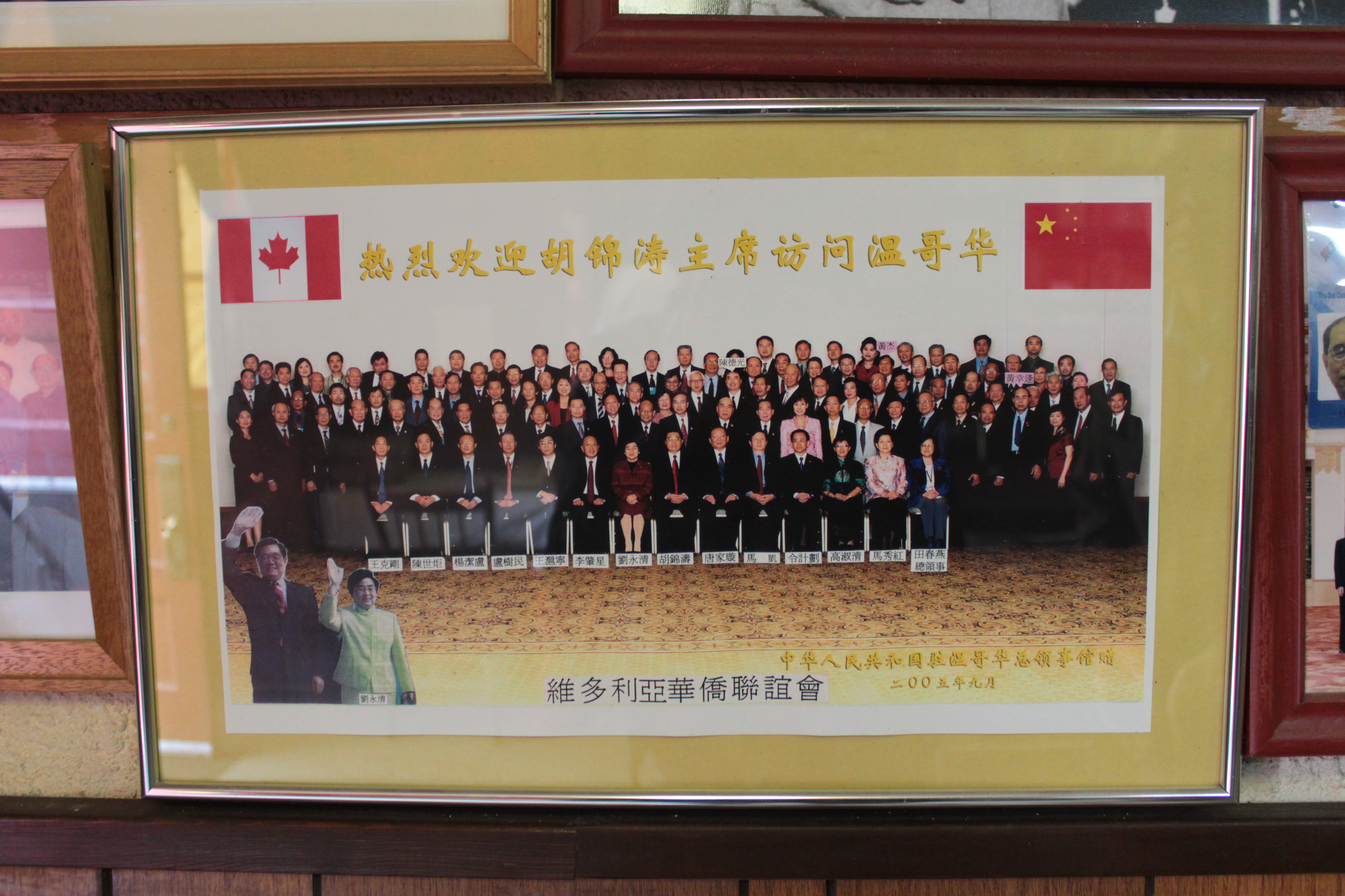 Picture of Chinese President Hu Jintao visiting Vancouver in September, 2005. Given by the Consulate-General of the People's Republic of China in Vancouver (中华人民共和国驻温哥华总领馆) to Chinese Canadian Cultural Association (維多利亞華僑聯誼會). Front row, from left to right: Wang Kegang (王克剛); Cheng Shiju (陳世炬); Yang Jielu (楊潔盧); Lu Shumin (盧樹民); Wang Huning (王滬寧); Li Zhaoxing (李肇星); Liu Yongqing (劉永清); Hu Jingtao (胡錦濤); Ma Kai (馬凱); Ling Jihua (令計劃); Gao Shuqing (高淑清); Ma Xiuhong (馬秀紅); Tian Chunyan (田春燕).