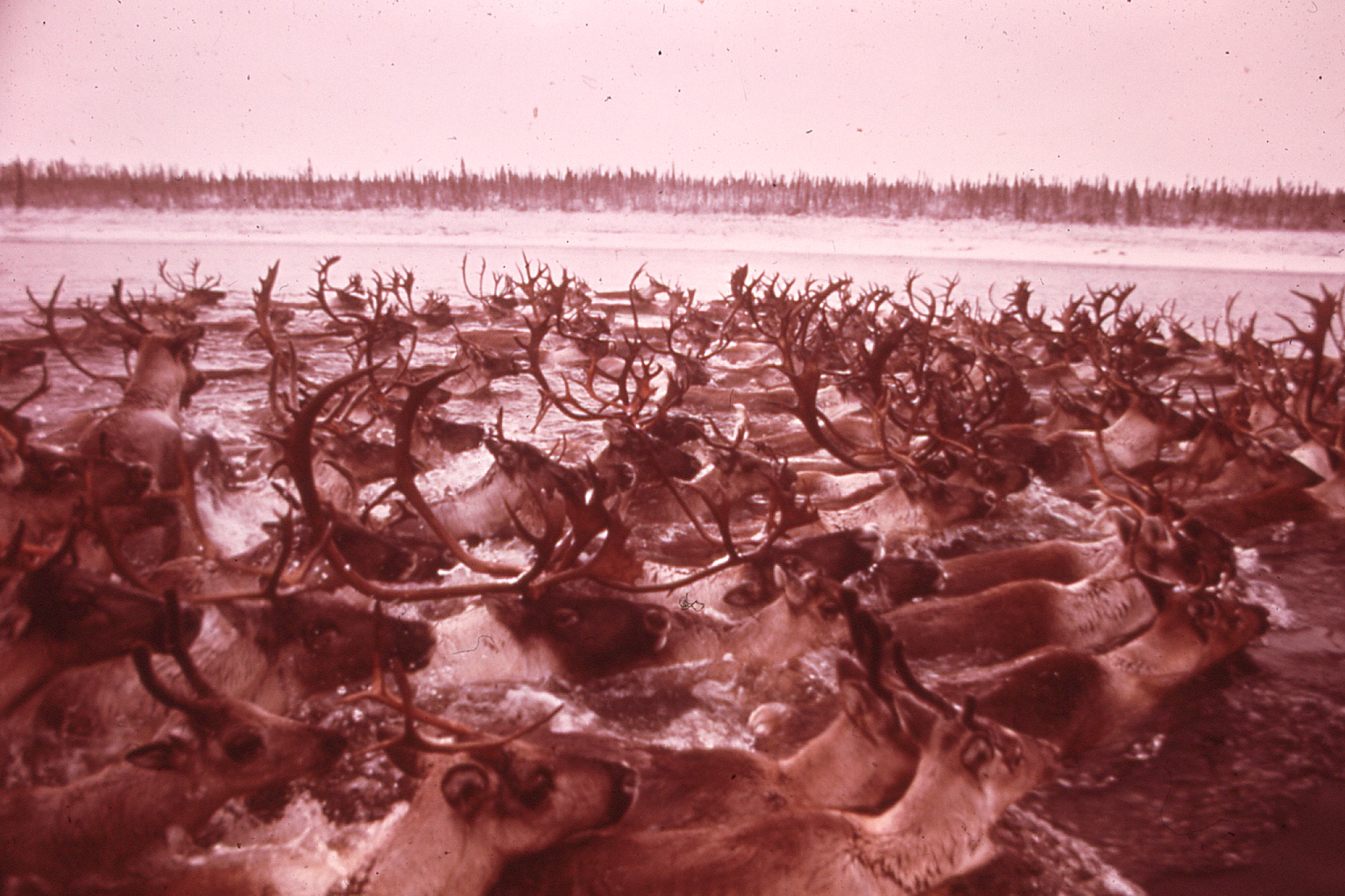 View of caribou migrating through water. These are slides used in a boreal lecture. There are no notes for them. They appear to be Ian McTaggart-Cowan's photos.