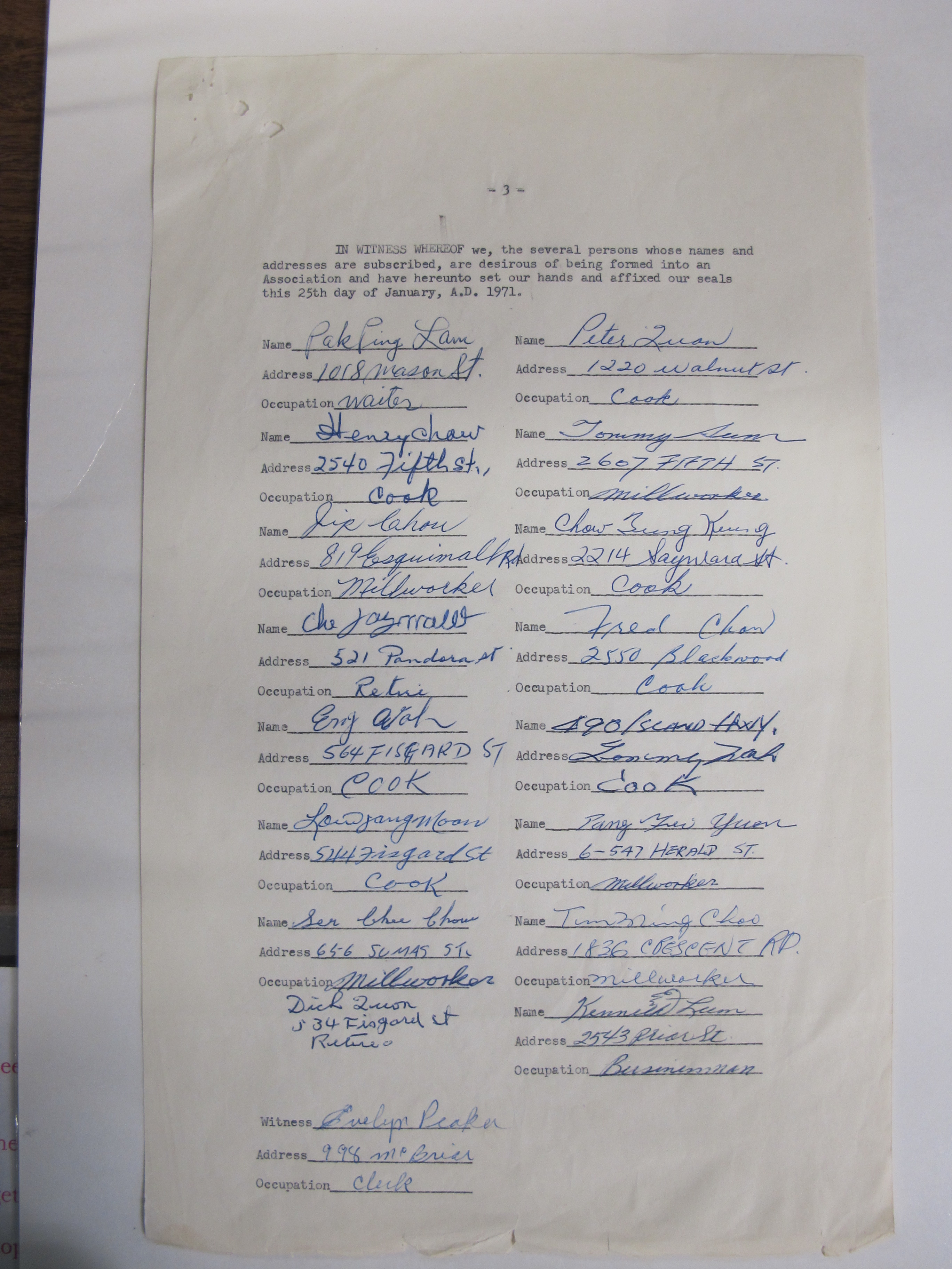 This document explains the regulations of the association, and lists the names, addresses and occupations of the founding members in 1971. Signed on 25 January 1971. Later name: Chinese Canadian Cultural Association. The association headquartered at 535 Fisgard Street, Victoria, B.C. and was intended to help new immigrants from China adapt to life in Canada. Identifier: BC Registry Services: Society files No. S9134.
