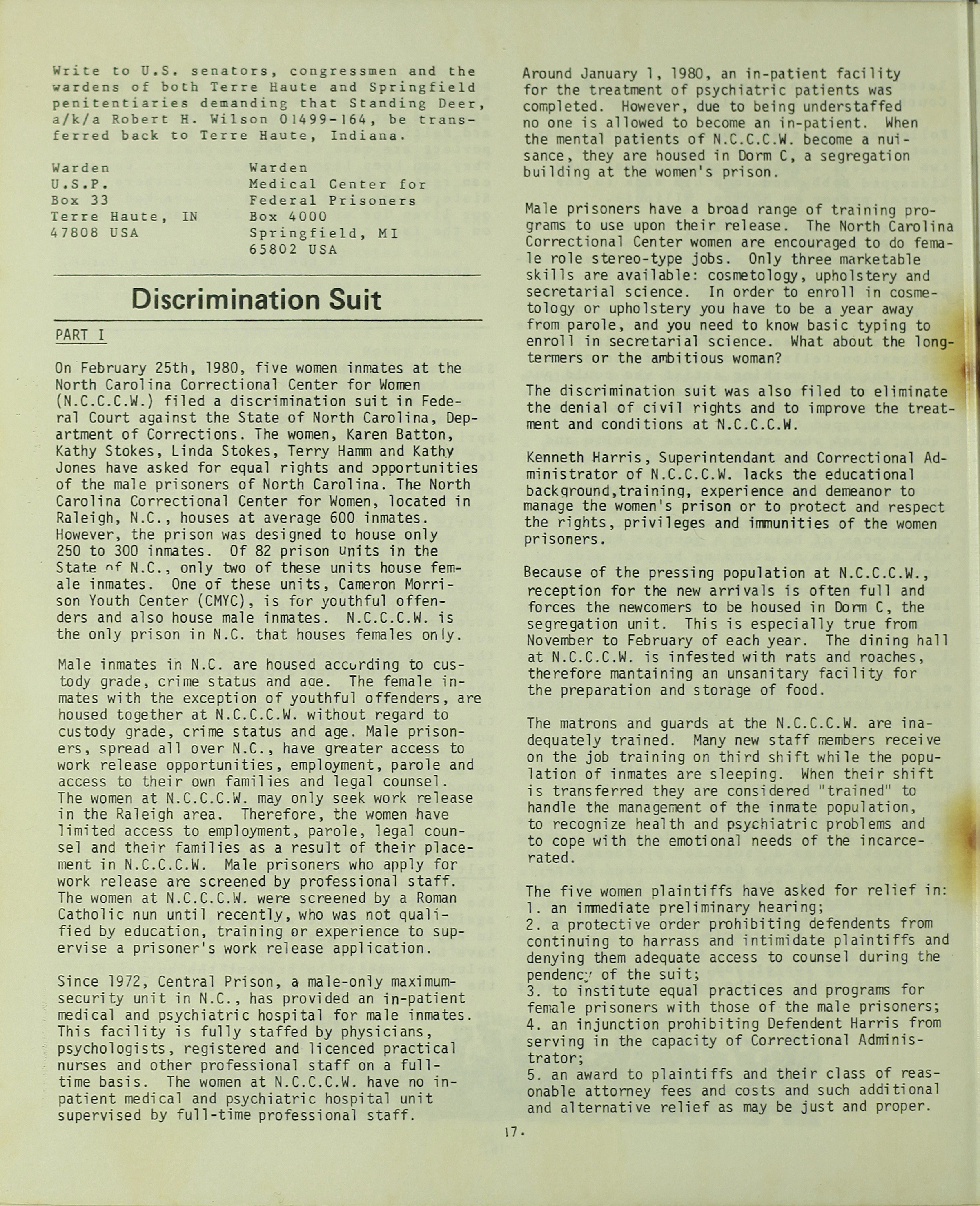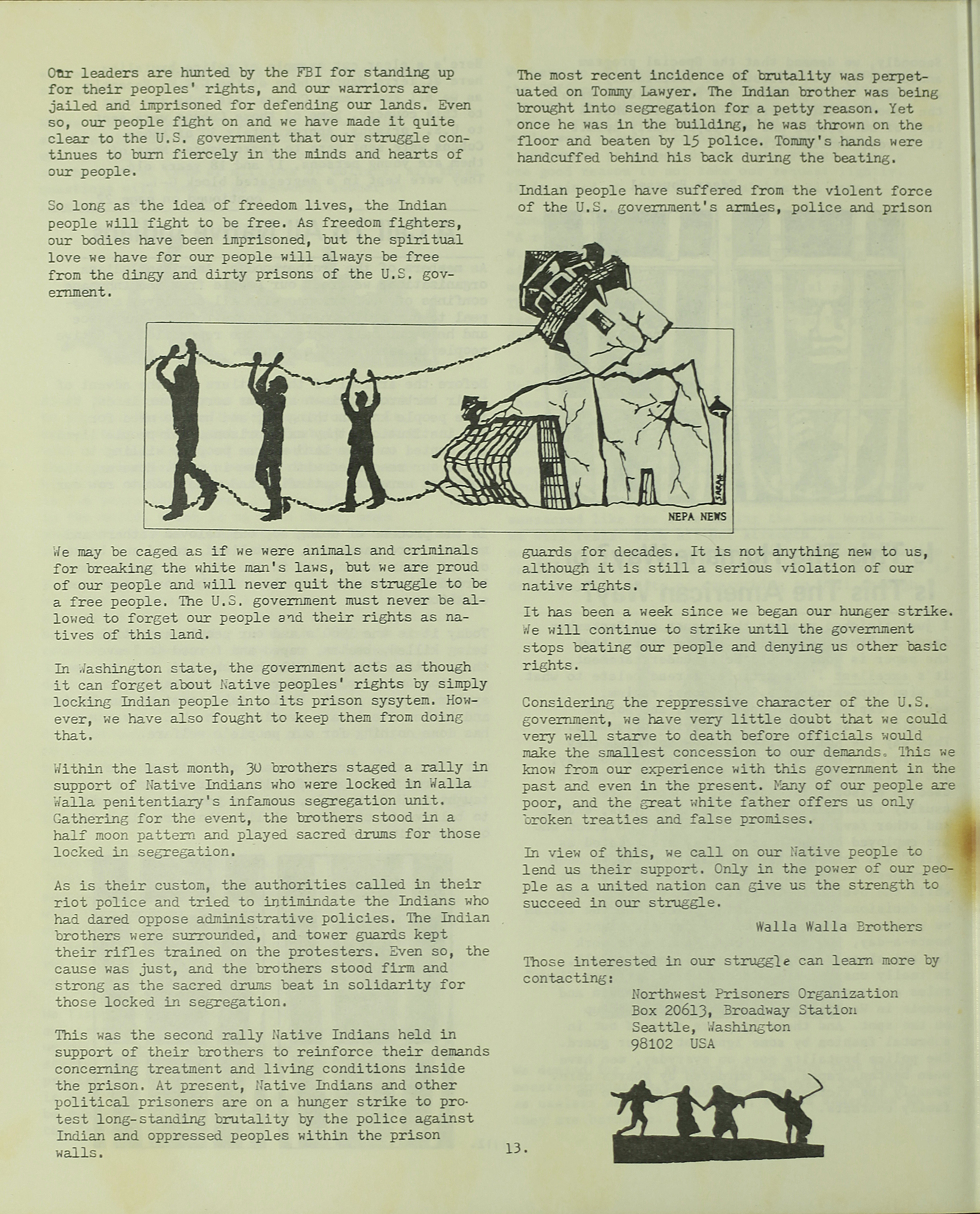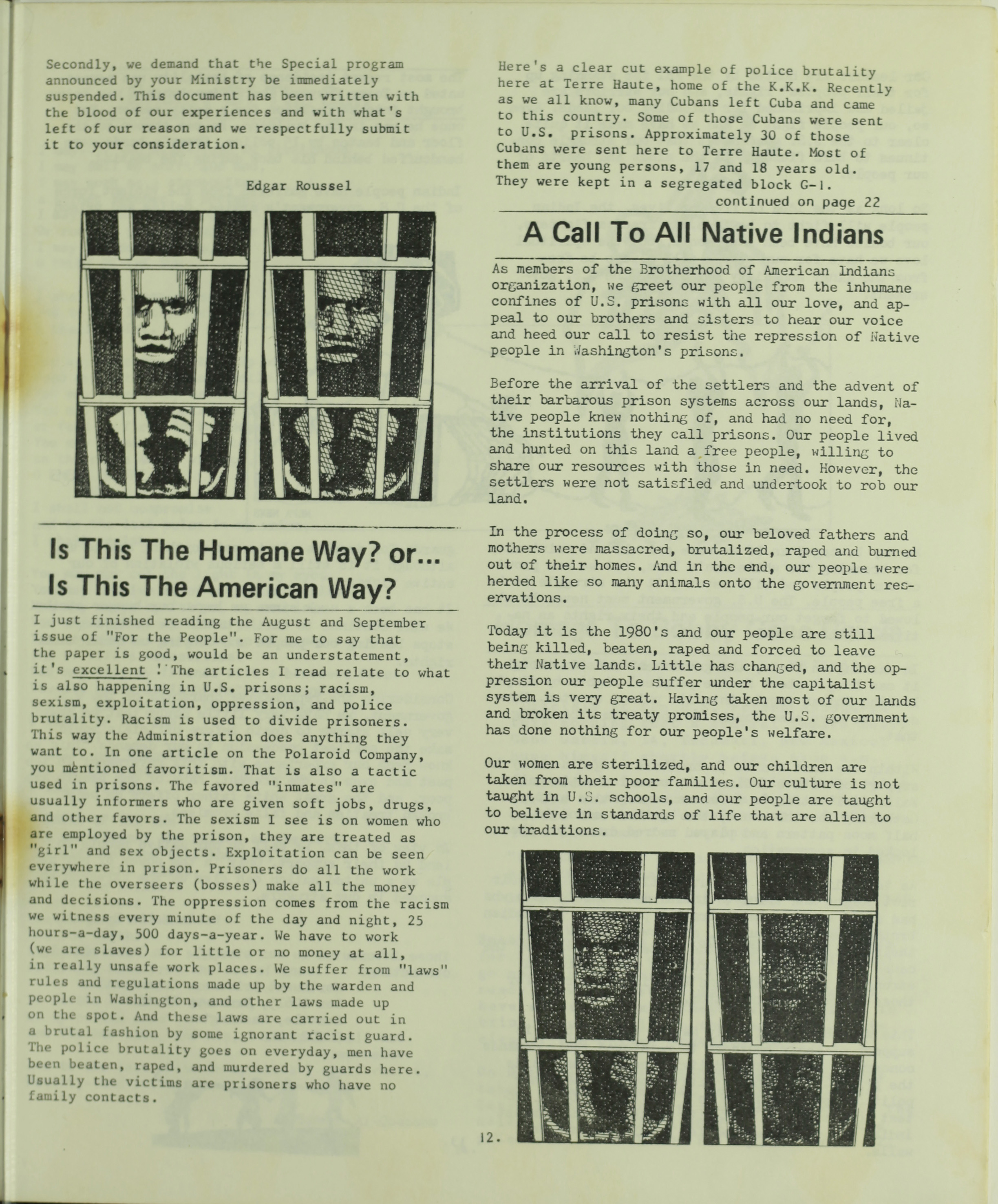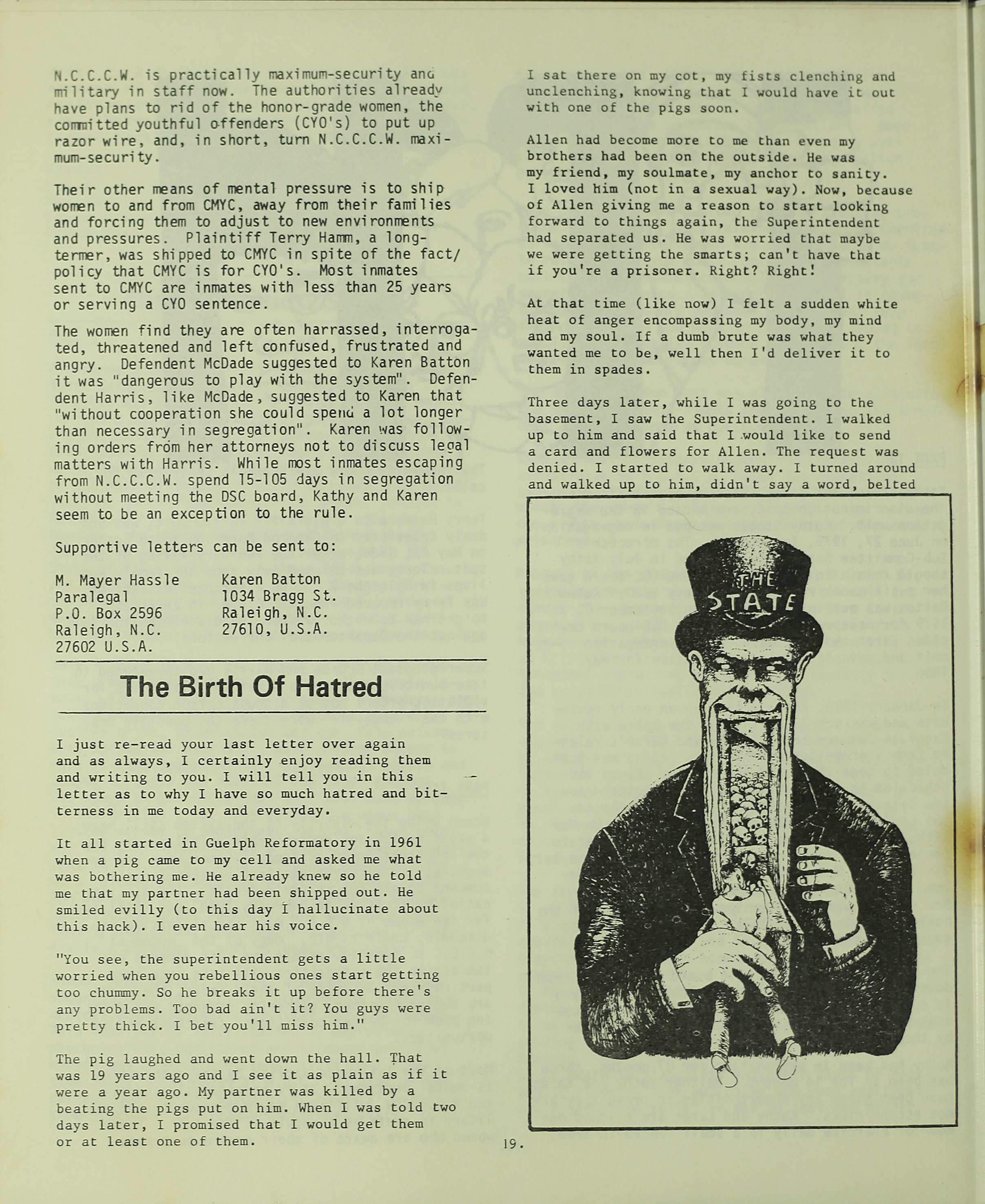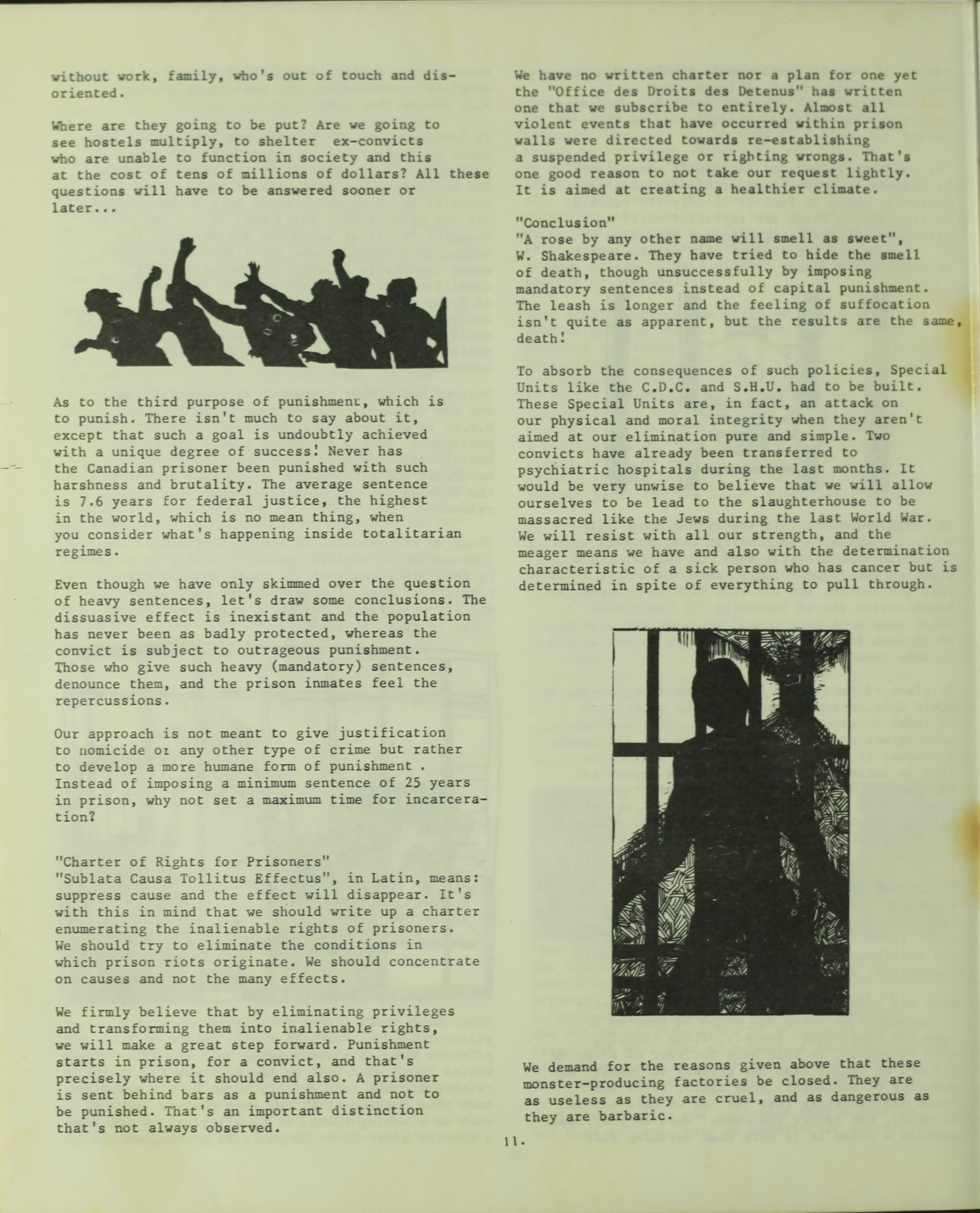 An anarchist publication from Toronto made to support prisoners in various penal institutions. It began in 1980 and featured articles, letters, art, poetry etc. by prisoners and ex-prisoners. By Spring 1997 it had incorporated another journal called the Prison News Service and began to focus more on justice-related issues in Canada, namely: prisons, local jails, refugee detention centres, and First Nations self-determination. In this issue: "Communication and repression"; "Clockwork orange"; "Frame up!"; "I'm flying higher than you" [poem] by Rick Levesque; "Prelude to Dorchester hostage-taking"; "Open letter to Kaplan"; "A call to all Native Indians"; "Is this the humane way? or...is this the American way?"; "Enemy of the sun" [poem] by Sameeh Al-Quassem; "Homage to Bobby Gene Garcia" by Standing Deer; "Discrimination suit"; "The birth of hatred"; "Cries for help ignored"; "On the run"; "Responses to tunnel vision"; "The law (which is not concerned with truth and justice)" by Carl Harp; "The rose of Dresden" by Standing Deer; "The bellower's education" [poem by] Karen Batton; "Fuck you" [poem by] Freddie Jo Morry, Archimbault; "Dreams" [poem by] Gypsy Chaboyer, Kingston; "Transfer from Springfield".