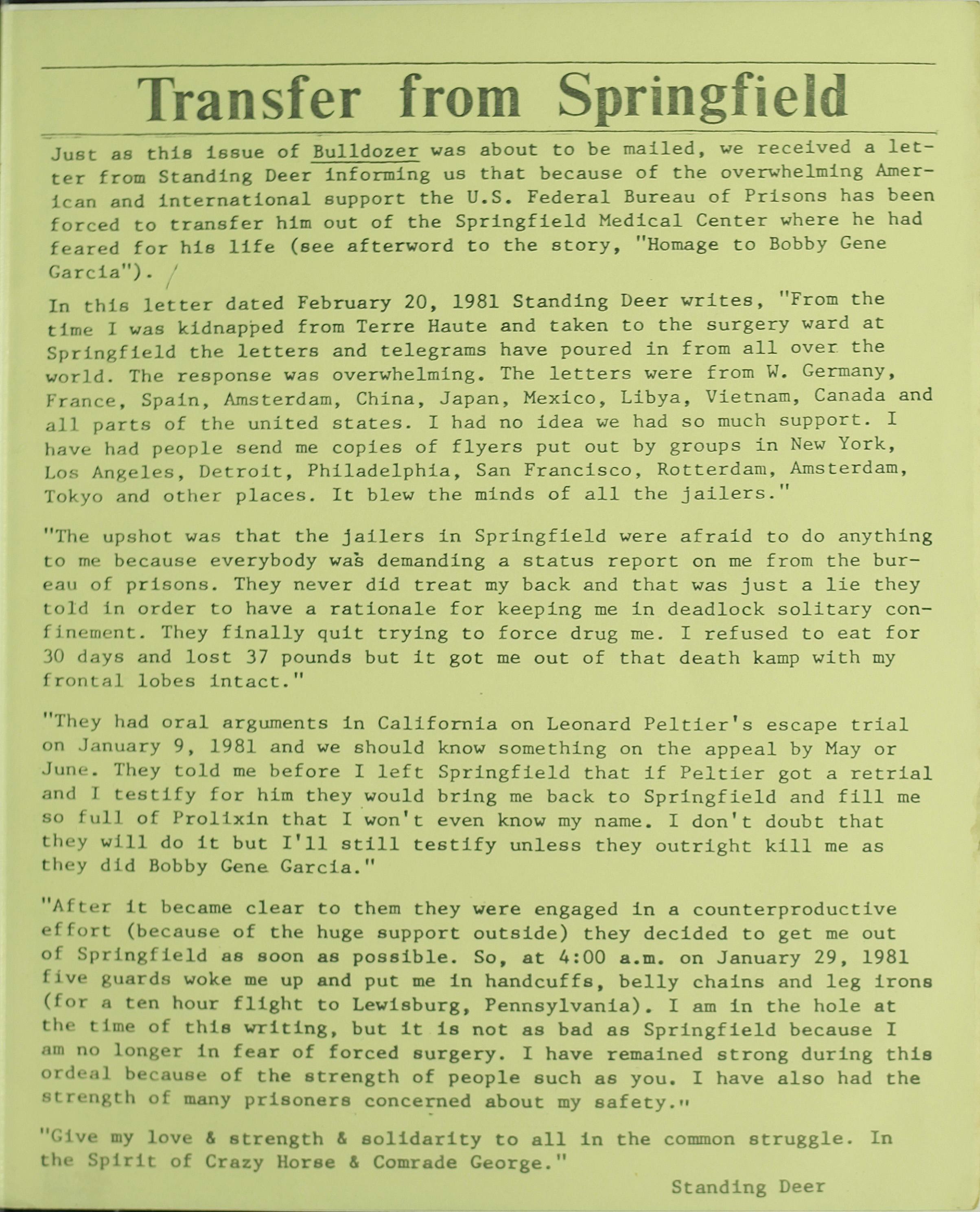 An anarchist publication from Toronto made to support prisoners in various penal institutions. It began in 1980 and featured articles, letters, art, poetry etc. by prisoners and ex-prisoners. By Spring 1997 it had incorporated another journal called the Prison News Service and began to focus more on justice-related issues in Canada, namely: prisons, local jails, refugee detention centres, and First Nations self-determination. In this issue: "Communication and repression"; "Clockwork orange"; "Frame up!"; "I'm flying higher than you" [poem] by Rick Levesque; "Prelude to Dorchester hostage-taking"; "Open letter to Kaplan"; "A call to all Native Indians"; "Is this the humane way? or...is this the American way?"; "Enemy of the sun" [poem] by Sameeh Al-Quassem; "Homage to Bobby Gene Garcia" by Standing Deer; "Discrimination suit"; "The birth of hatred"; "Cries for help ignored"; "On the run"; "Responses to tunnel vision"; "The law (which is not concerned with truth and justice)" by Carl Harp; "The rose of Dresden" by Standing Deer; "The bellower's education" [poem by] Karen Batton; "Fuck you" [poem by] Freddie Jo Morry, Archimbault; "Dreams" [poem by] Gypsy Chaboyer, Kingston; "Transfer from Springfield".