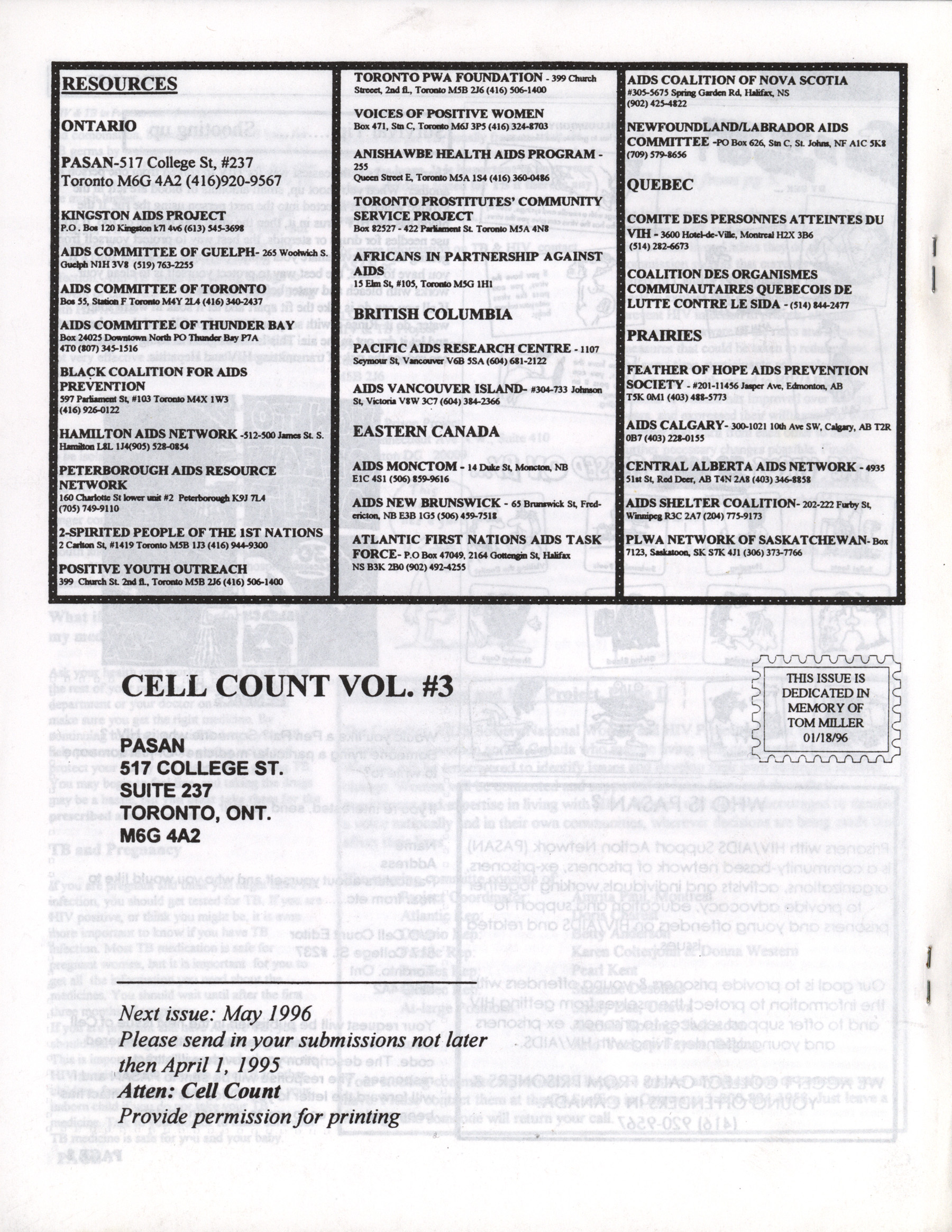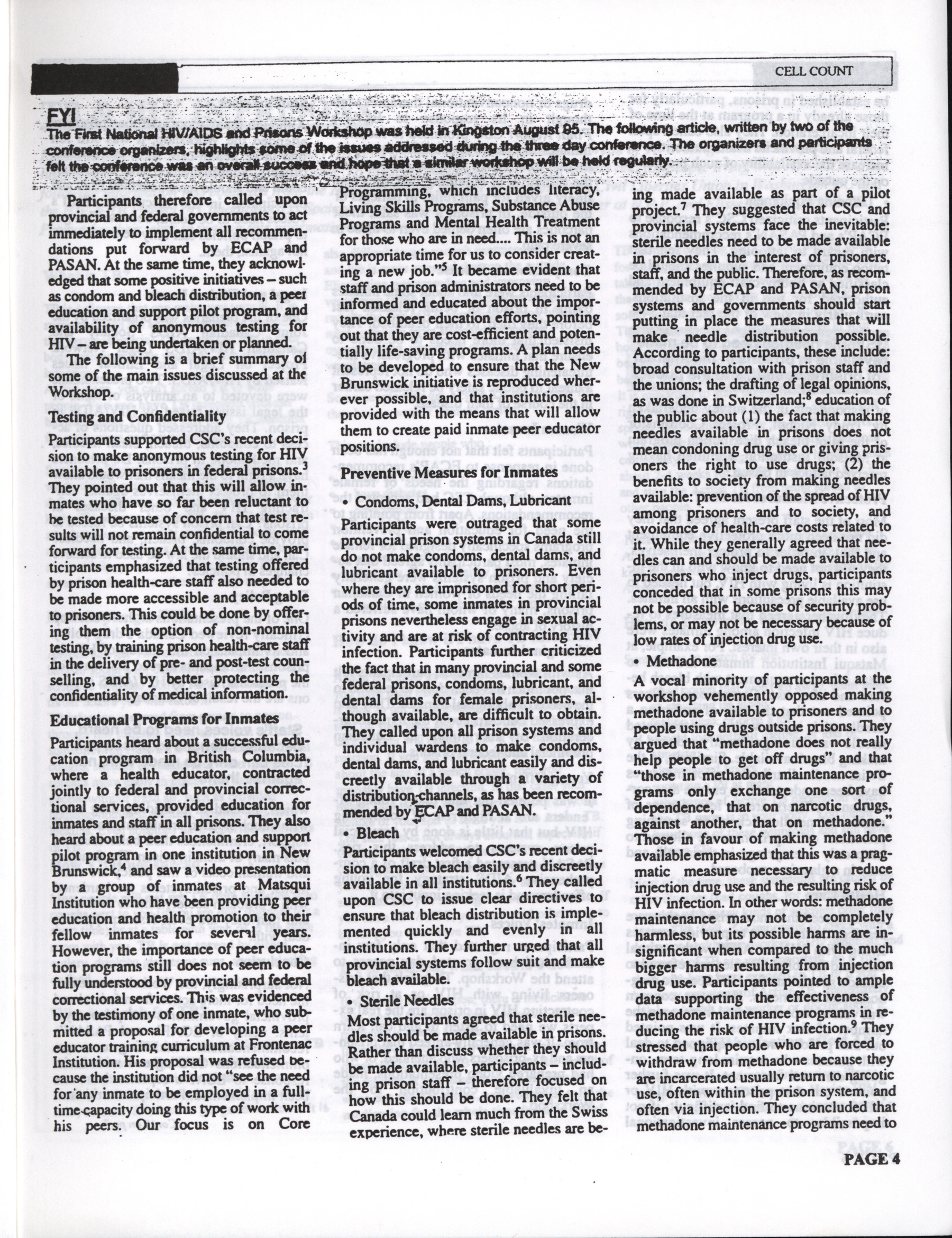 A newsletter by and for prisoners and ex-prisoners and others concerned with the crisis of HIV/AIDS in prisons. Published by PASAN (Prisoners with HIV/AIDS Support Action Network), Toronto, ON. In this issue: ABC's of hepatitis -- George's corner -- FYI {highlights of the First National HIV/AIDS and Prisoners Workshop, Kingston, Ont, August 1995] -- TB & HIV in prisons --National women and HIV project, phase II -- Survival tip- shooting up -- Resources.