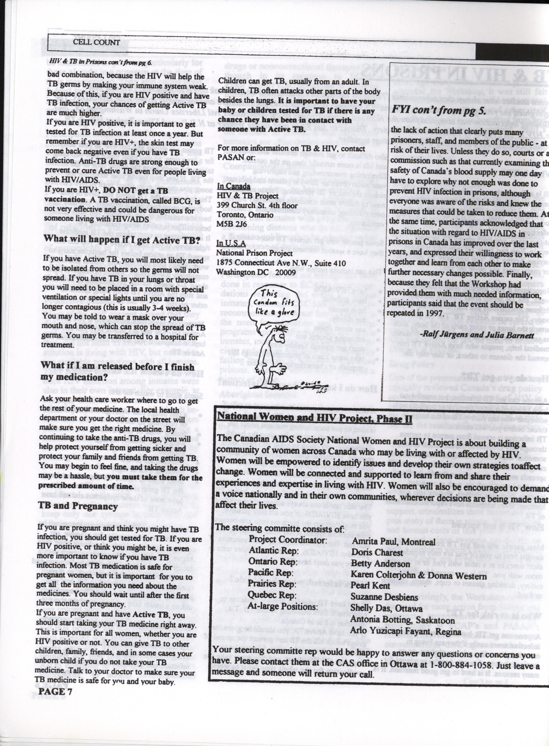 A newsletter by and for prisoners and ex-prisoners and others concerned with the crisis of HIV/AIDS in prisons. Published by PASAN (Prisoners with HIV/AIDS Support Action Network), Toronto, ON. In this issue: ABC's of hepatitis -- George's corner -- FYI {highlights of the First National HIV/AIDS and Prisoners Workshop, Kingston, Ont, August 1995] -- TB & HIV in prisons --National women and HIV project, phase II -- Survival tip- shooting up -- Resources.