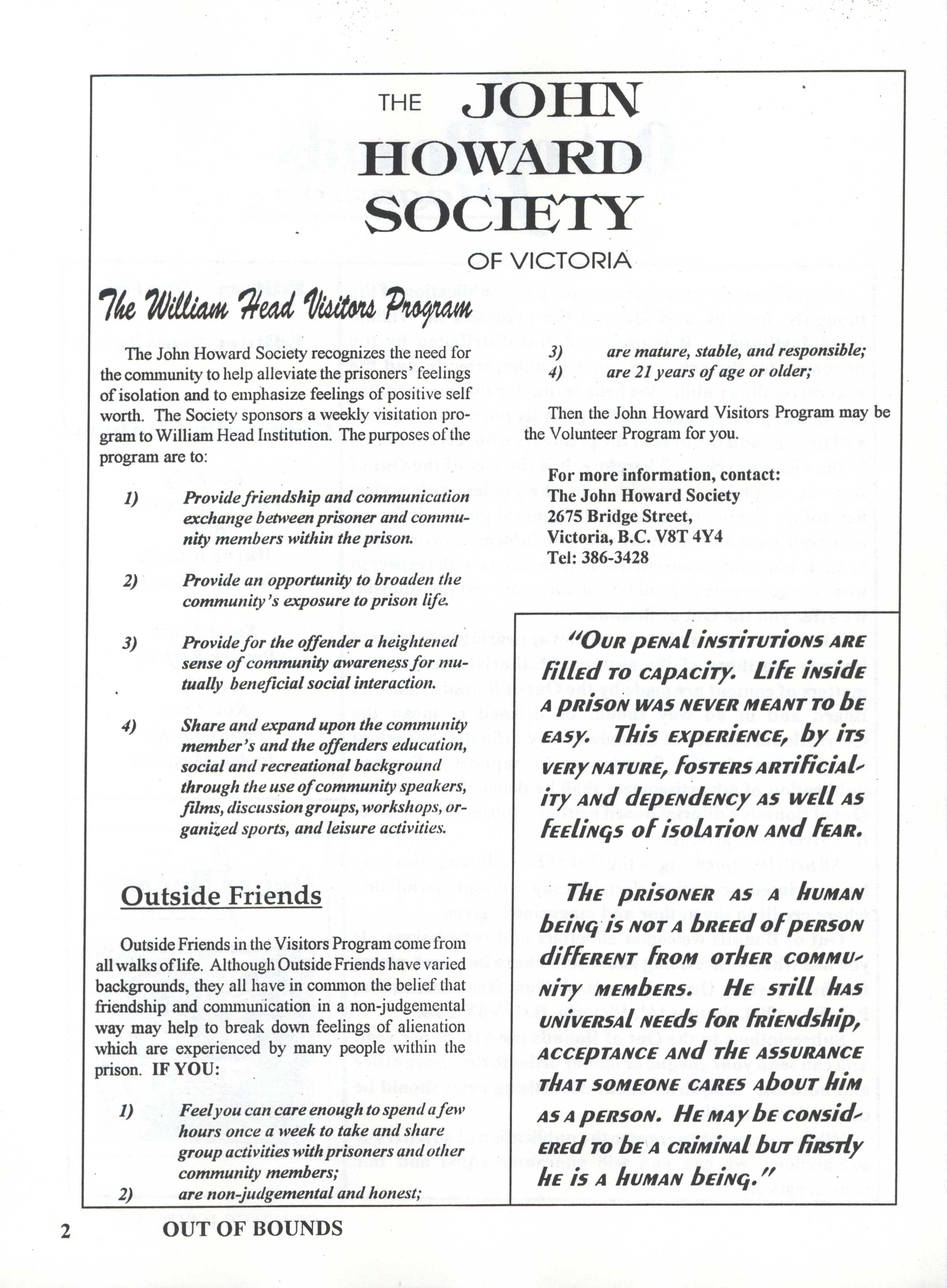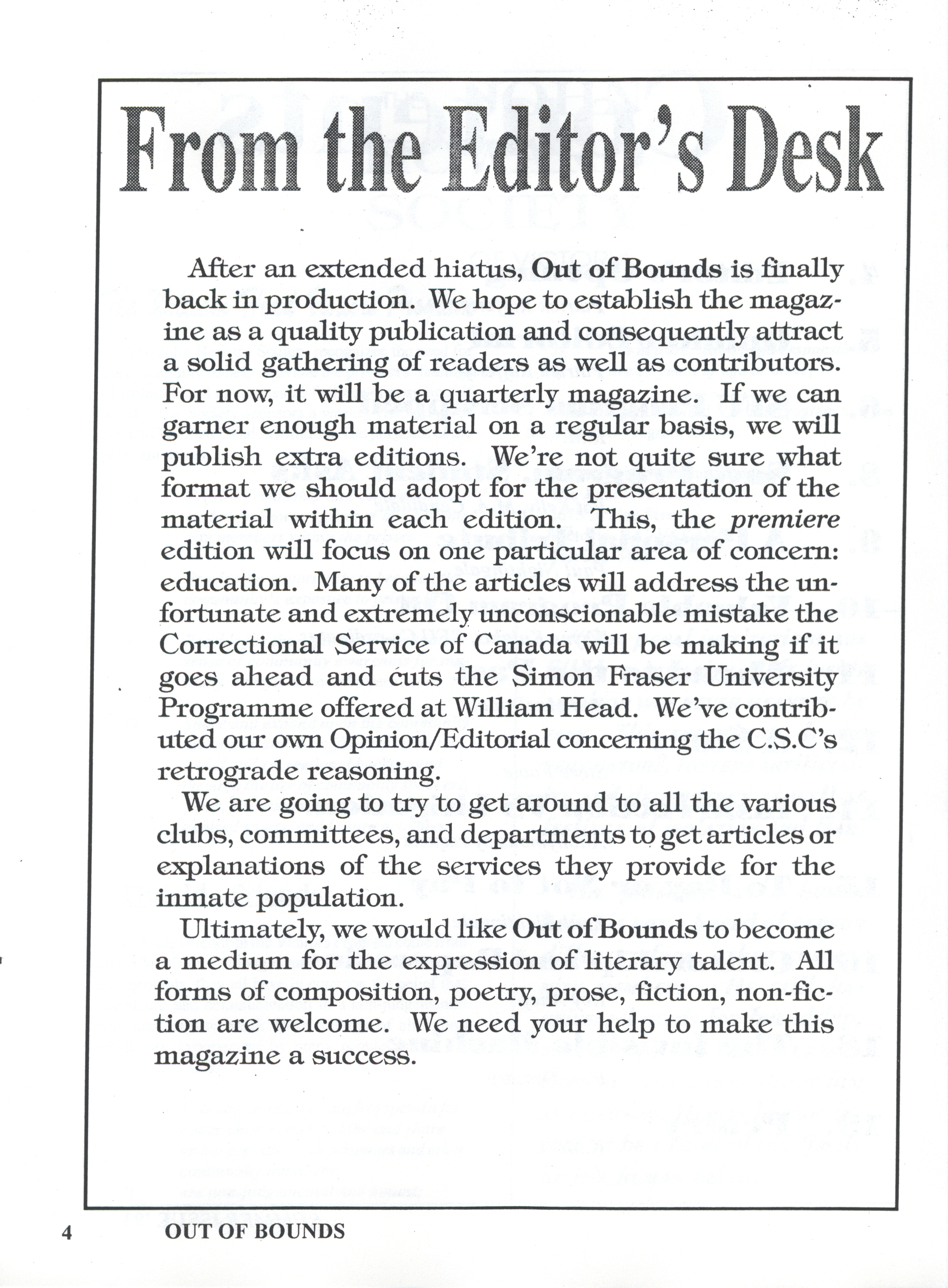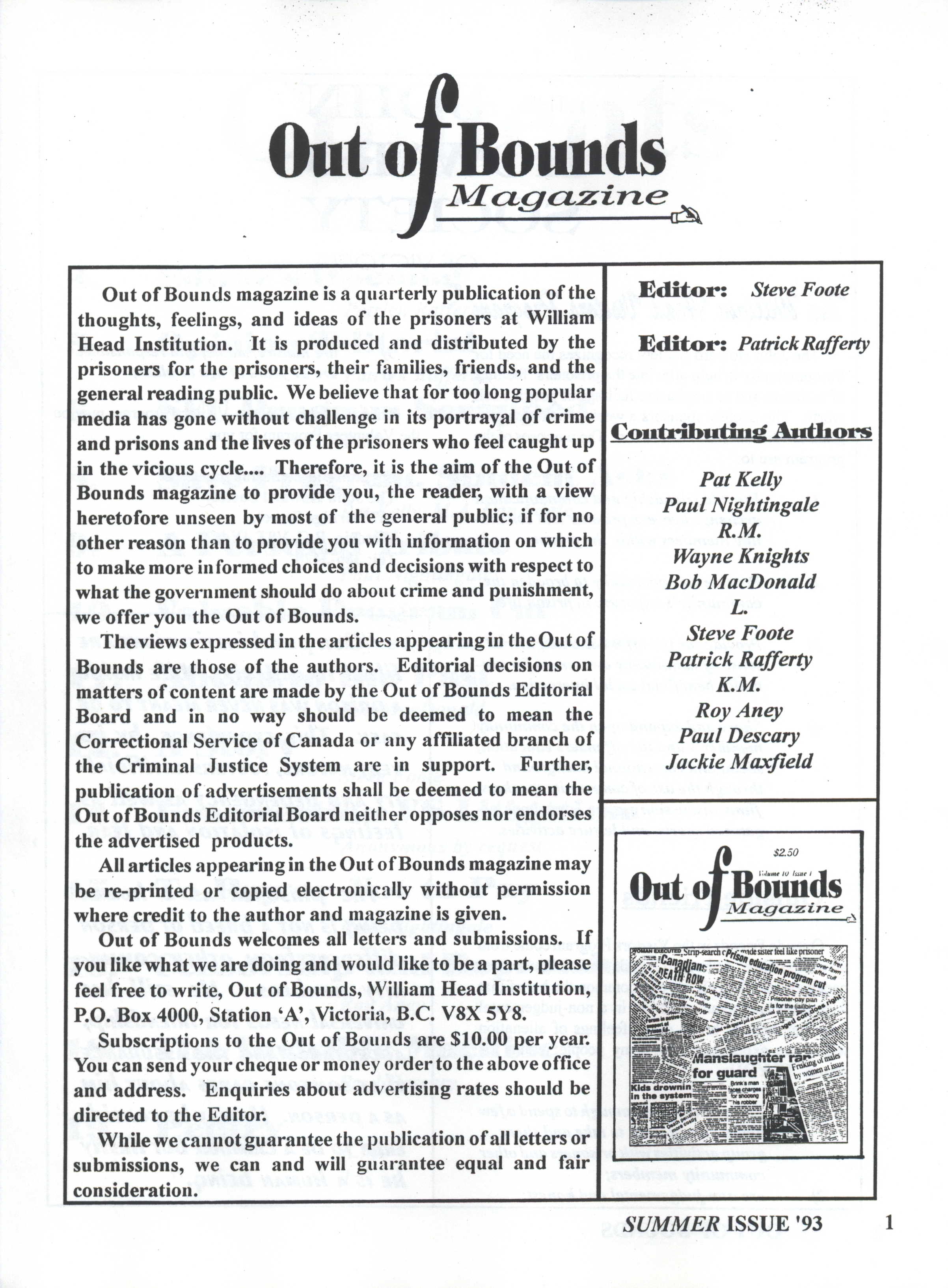 Article topics include: "Out of bounds" back in production after extended hiatus; this issue focuses on "education", especially the mistake that the correctional Service of Canada will be making if it goes ahead and cuts the Simon Fraser University program offered at William Head. HISTORICAL NOTE: From 1973 to 1993 university liberal arts courses were offered to prisoners in several federal correctional institutions in British Columbia, Canada. Delivered first by the University of Victoria (1973-1984) and then by Simon Fraser University (1984-1993), well over a thousand individual prisoners were enrolled in courses taught by university faculty in traditional seminar settings within the prisons. Ranging from maximum to medium security, each of the correctional institutions contained a relatively self-contained "learning centers" or "academic community" behind the prison walls and fences. The university program in British Columbia was based on the premise that education could result in rehabilitative outcomes. This premise stemmed from the conviction that education in the liberal arts, if carried out properly, could trigger processes of individual reclamation, reformation, and in some cases transformation. This conviction was in turn built on a diverse set of theoretical foundations in adult education and psychology, focusing in particular on the role of humanistic study in encouraging cognitive and moral development and the subsequent impact of that development on behaviour. A small research study carried out in 1979 reported very low rates of recidivism for program participants. (Ayers, et al., 1980; Duguid, 1981; Ross, 1980). In 1993 the university program was cancelled by the Correctional Service of Canada as a cost-cutting measure.