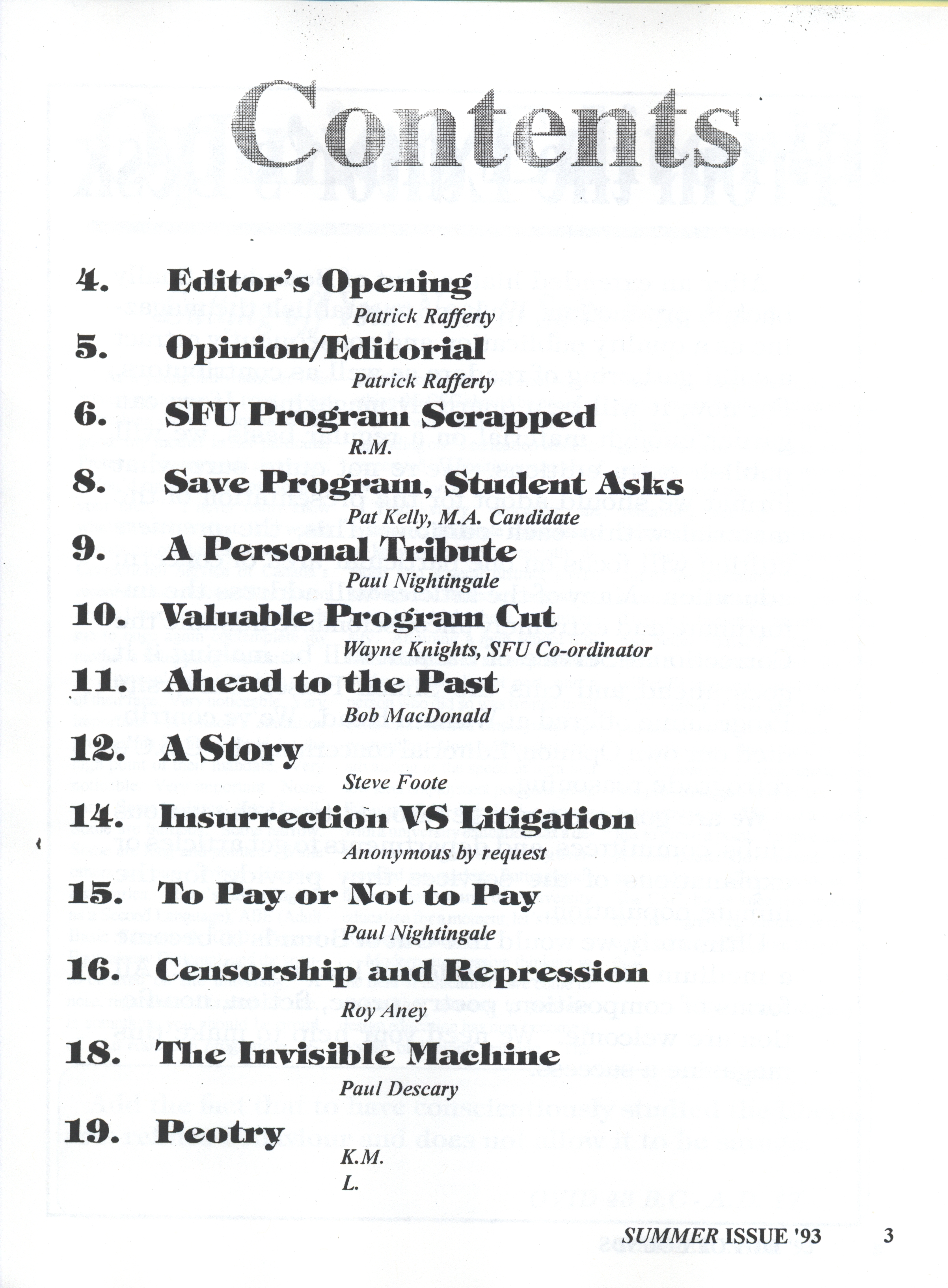 A non-profit quarterly publication of the thoughts, feelings, and distinct perspectives of prisoners and visitors by the prisoners at William Head Institution in Victoria, B.C. with the aim of providing a different view to the general public. Edited by Patrick W. Rafferty and Steve Foote.