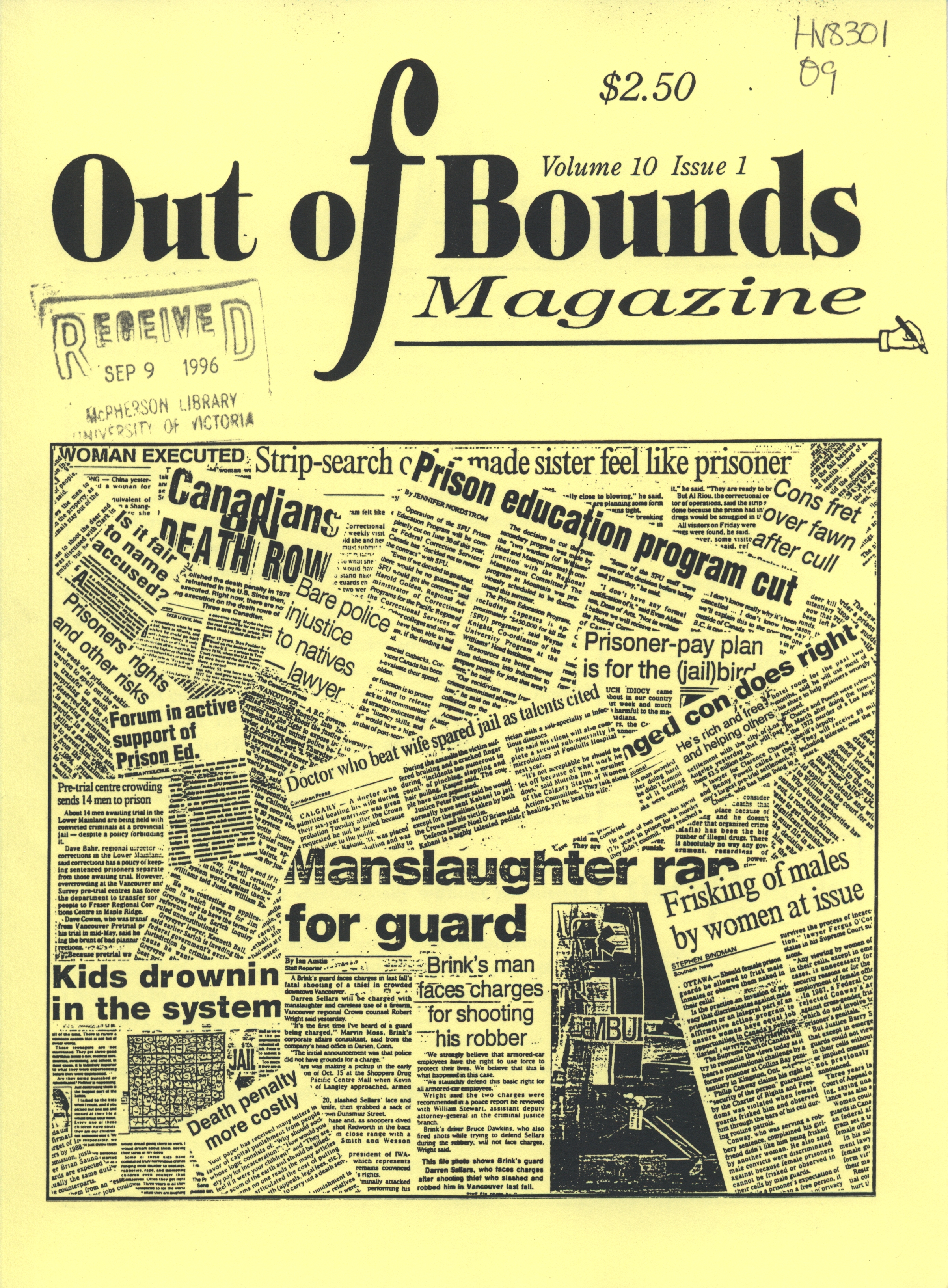 Article topics include: "Out of bounds" back in production after extended hiatus; this issue focuses on "education", especially the mistake that the correctional Service of Canada will be making if it goes ahead and cuts the Simon Fraser University program offered at William Head. HISTORICAL NOTE: From 1973 to 1993 university liberal arts courses were offered to prisoners in several federal correctional institutions in British Columbia, Canada. Delivered first by the University of Victoria (1973-1984) and then by Simon Fraser University (1984-1993), well over a thousand individual prisoners were enrolled in courses taught by university faculty in traditional seminar settings within the prisons. Ranging from maximum to medium security, each of the correctional institutions contained a relatively self-contained "learning centers" or "academic community" behind the prison walls and fences. The university program in British Columbia was based on the premise that education could result in rehabilitative outcomes. This premise stemmed from the conviction that education in the liberal arts, if carried out properly, could trigger processes of individual reclamation, reformation, and in some cases transformation. This conviction was in turn built on a diverse set of theoretical foundations in adult education and psychology, focusing in particular on the role of humanistic study in encouraging cognitive and moral development and the subsequent impact of that development on behaviour. A small research study carried out in 1979 reported very low rates of recidivism for program participants. (Ayers, et al., 1980; Duguid, 1981; Ross, 1980). In 1993 the university program was cancelled by the Correctional Service of Canada as a cost-cutting measure.