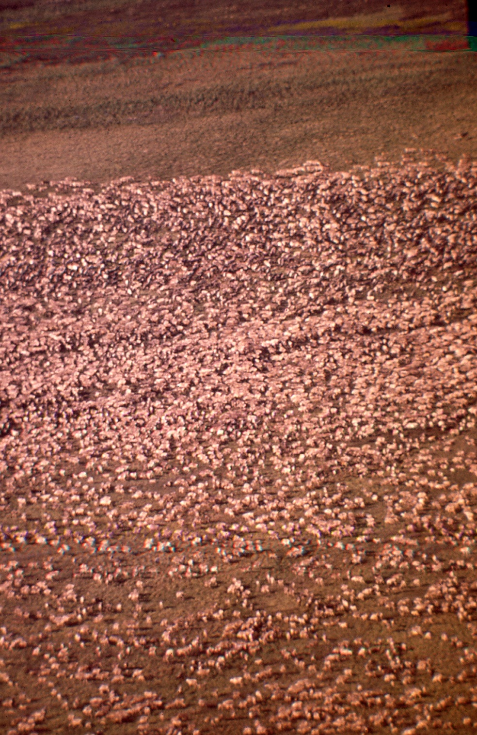 Ariel view of barren ground caribou migration. This caribou is found mainly in the Canada territories of Nunavut and Northwest Territories and migrate seasonally from the tundra to the taiga. (Family: cervidae; trinomial name: rangifer tarandus groenlandicus). These are slides used in a boreal lecture. There are no notes for them. They appear to be Ian McTaggart-Cowan's photos.